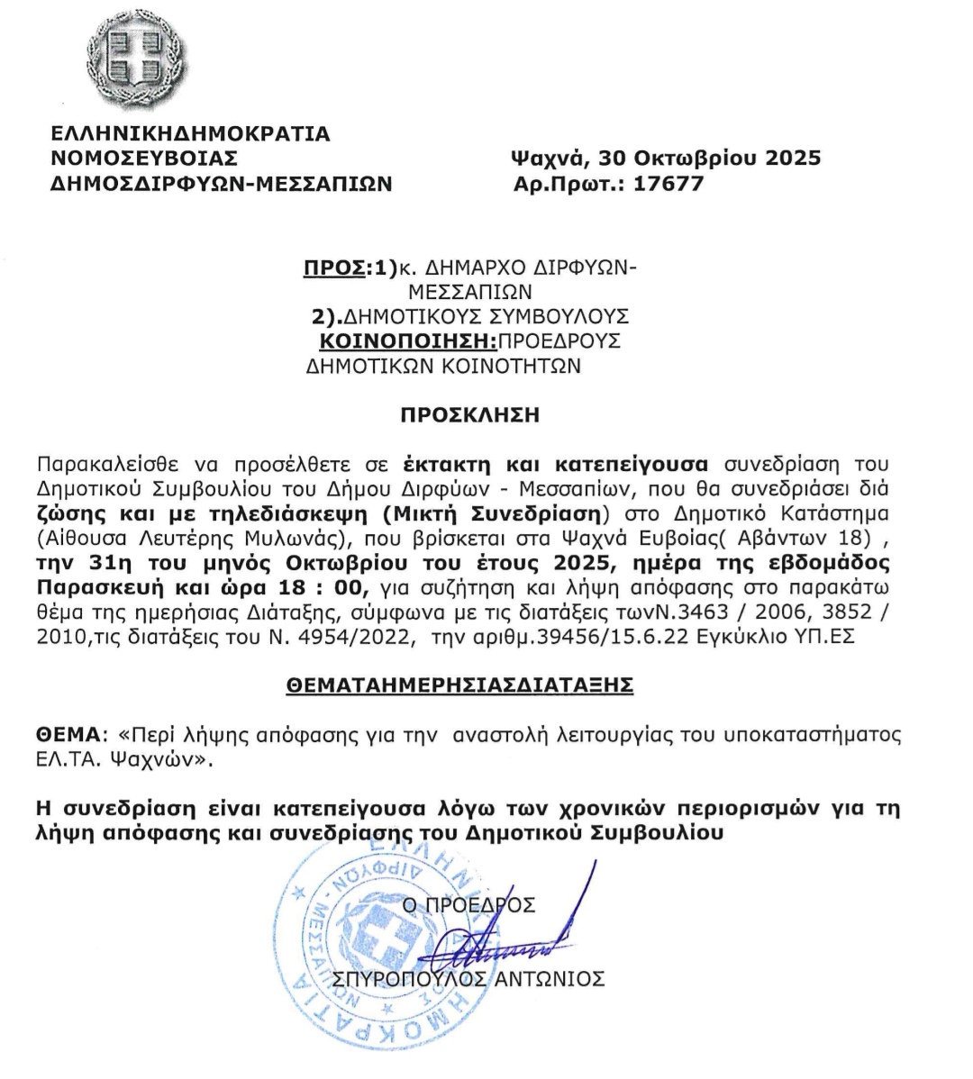 Κανένα αποτέλεσμα δεν υπήρξε από την προγραμματισμένη συνάντηση του Δημάρχου Διρφύων Μεσσαπίων Γιώργου Ψαθά με τον Διευθύνων σύμβουλο των ΕΛΤΑ καθώς ο Διευθύνων σύμβουλος δεν δέχτηκε τελικά η συνάντηση να πραγματοποιηθεί
