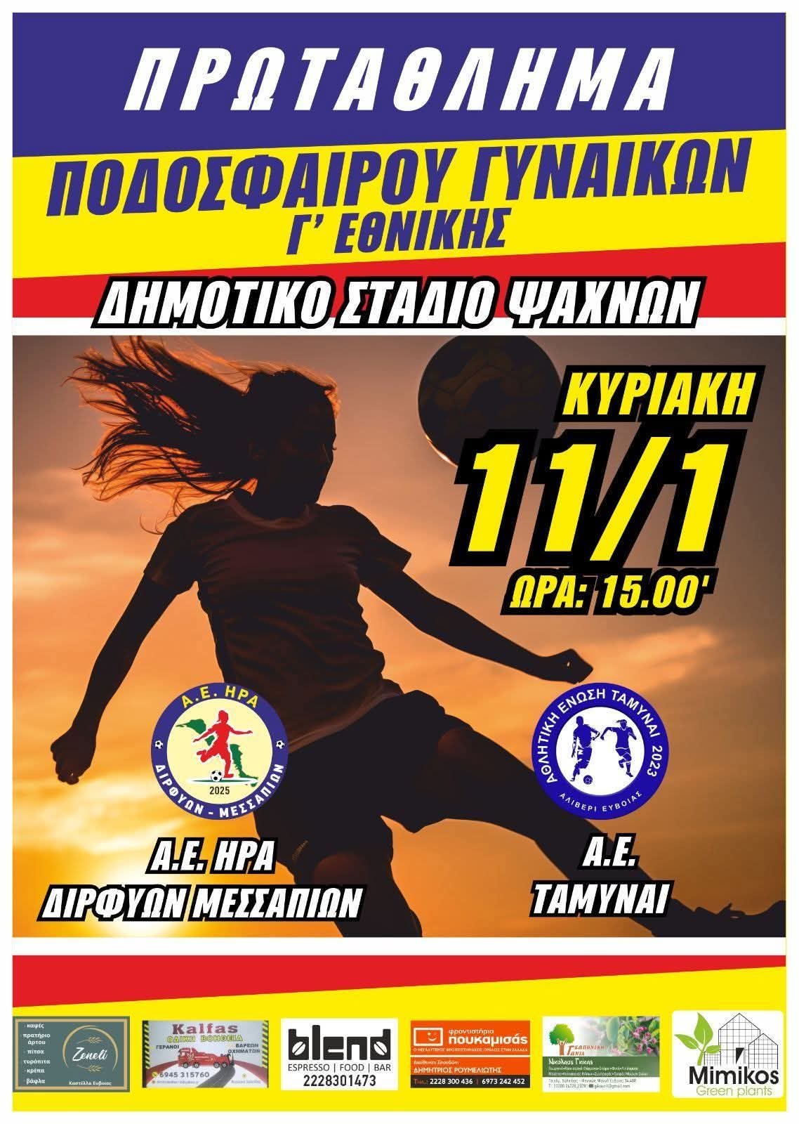 Η Α.Ε. Ήρα Διρφύων Μεσαπίων υποδέχεται την Α.Ε. Ταμυναϊ για την 9η αγωνιστική του 5ου Ομίλου του πρωταθλήματος της Γ Εθνικής Γυναικών Ελλάδος
