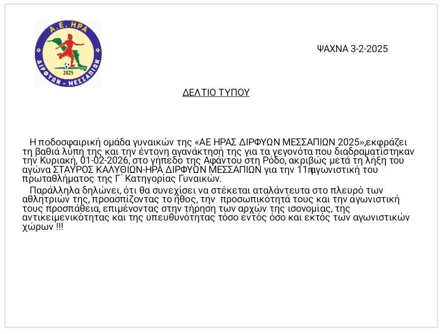 ΑΕ Ήρα Διρφύων Μεσσαπίων:Ανακοίνωση