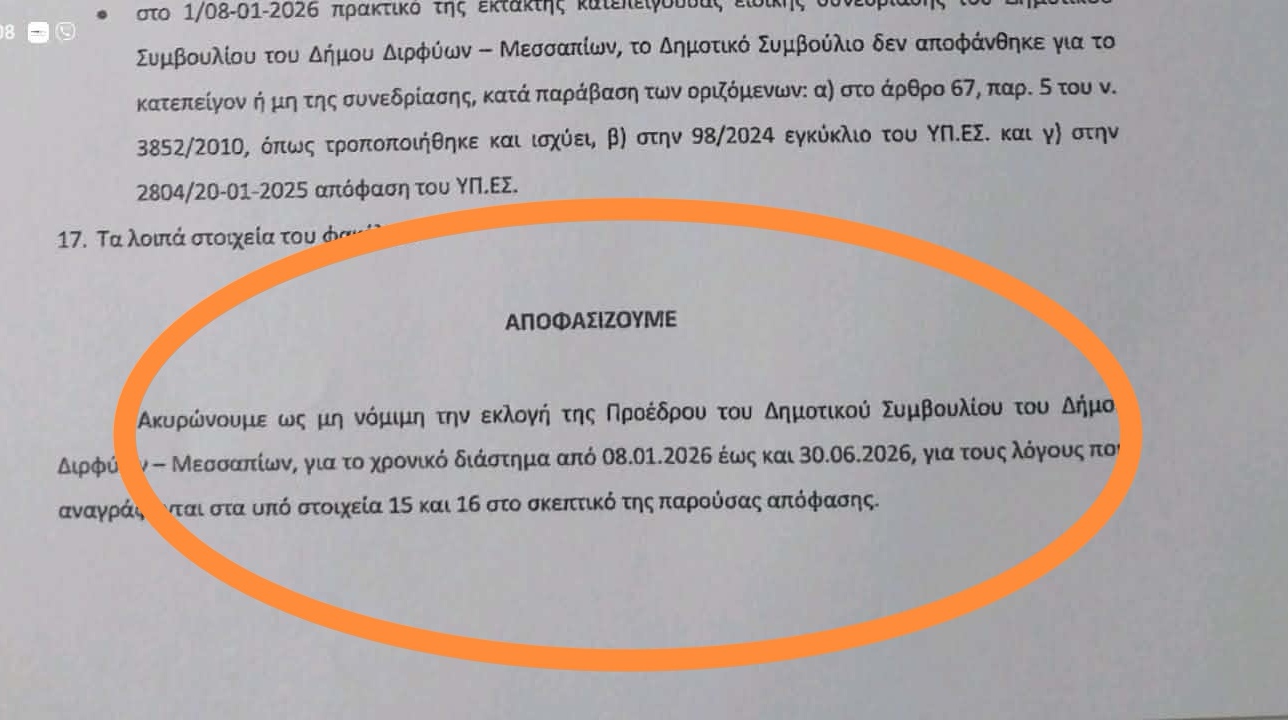 Ακυρώθηκε η εκλογή της Προέδρου του Δημοτικού συμβουλίου του Δήμου Διρφύων Μεσσαπίων