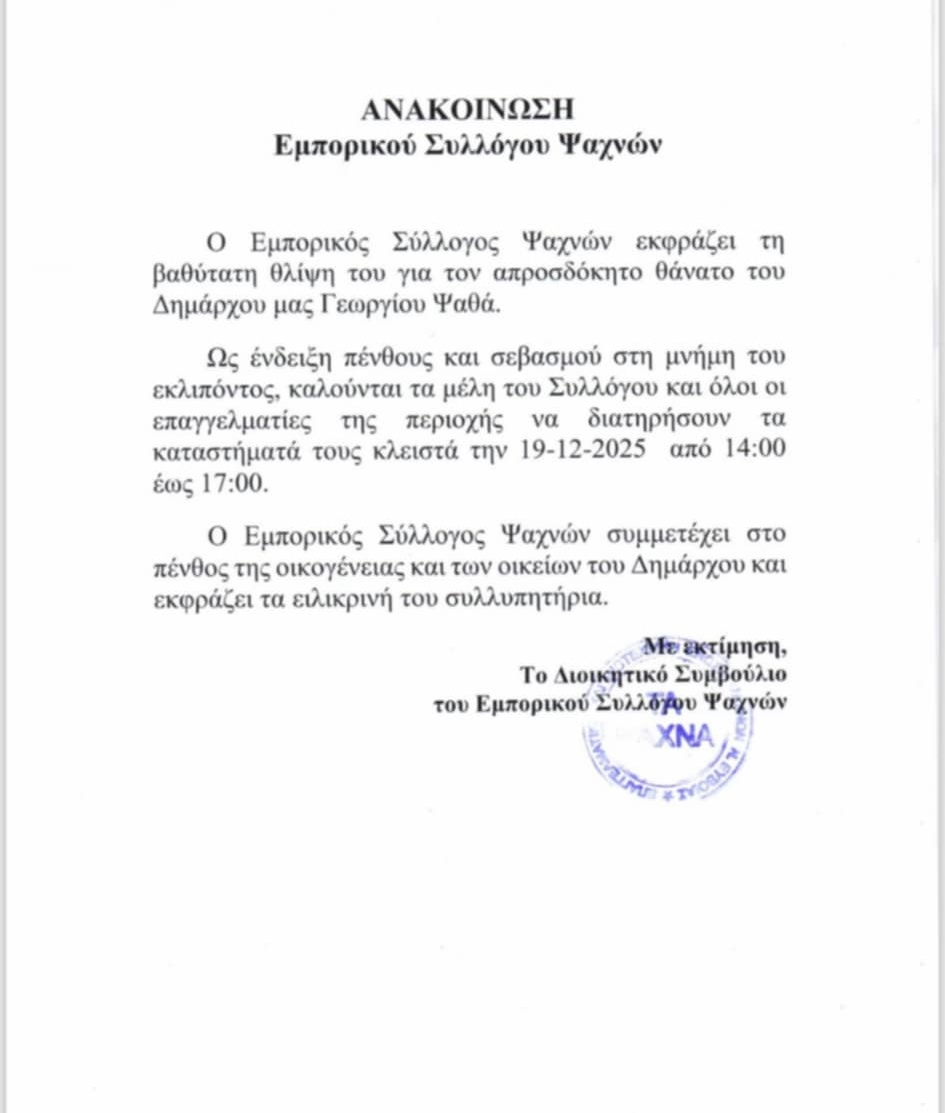 Ανακοίνωση εμπορικού Συλλόγου Ψαχνών για τον απροσδόκητο θάνατο του Δημάρχου Γιώργου Ψαθά