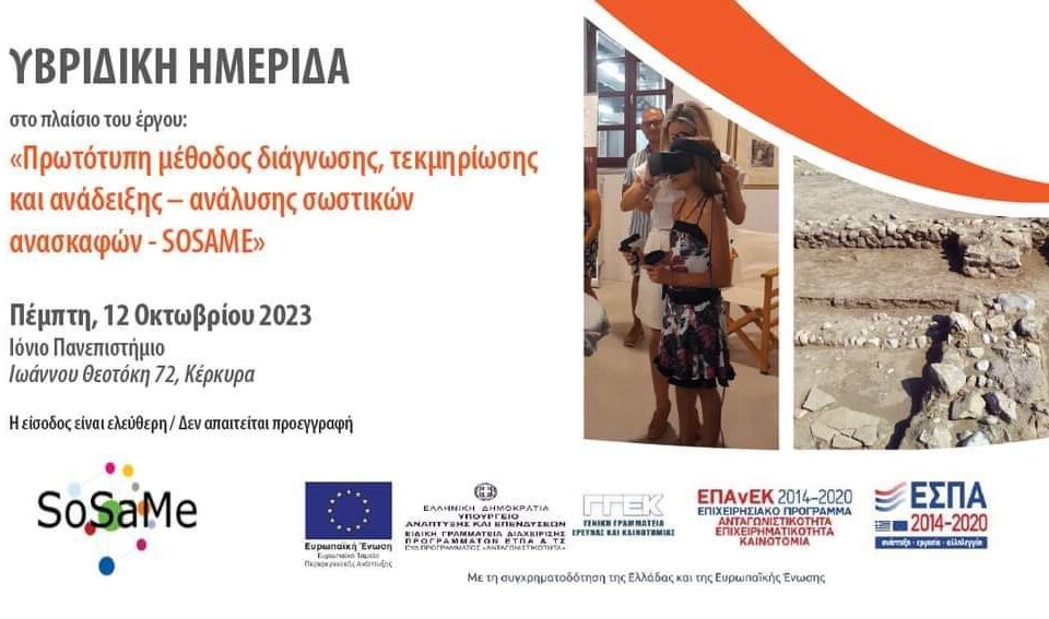 Στα πλαίσια της διεπιστημονικής συνεργασίας του έργου: Πρωτότυπη μέθοδος διάγνωσης, τεκμηρίωσης και ανάδειξης – ανάλυσης σωστικών ανασκαφών – SOSAME θα ακολουθήσει νέα παρουσίαση – Υβριδική Ημερίδα στο Ιόνιο Πανεπιστήμιο (Τμήμα Αρχειονομίας, Βιβλιοθηκονομίας και Μουσειολογίας) στην Κέρκυρα.
