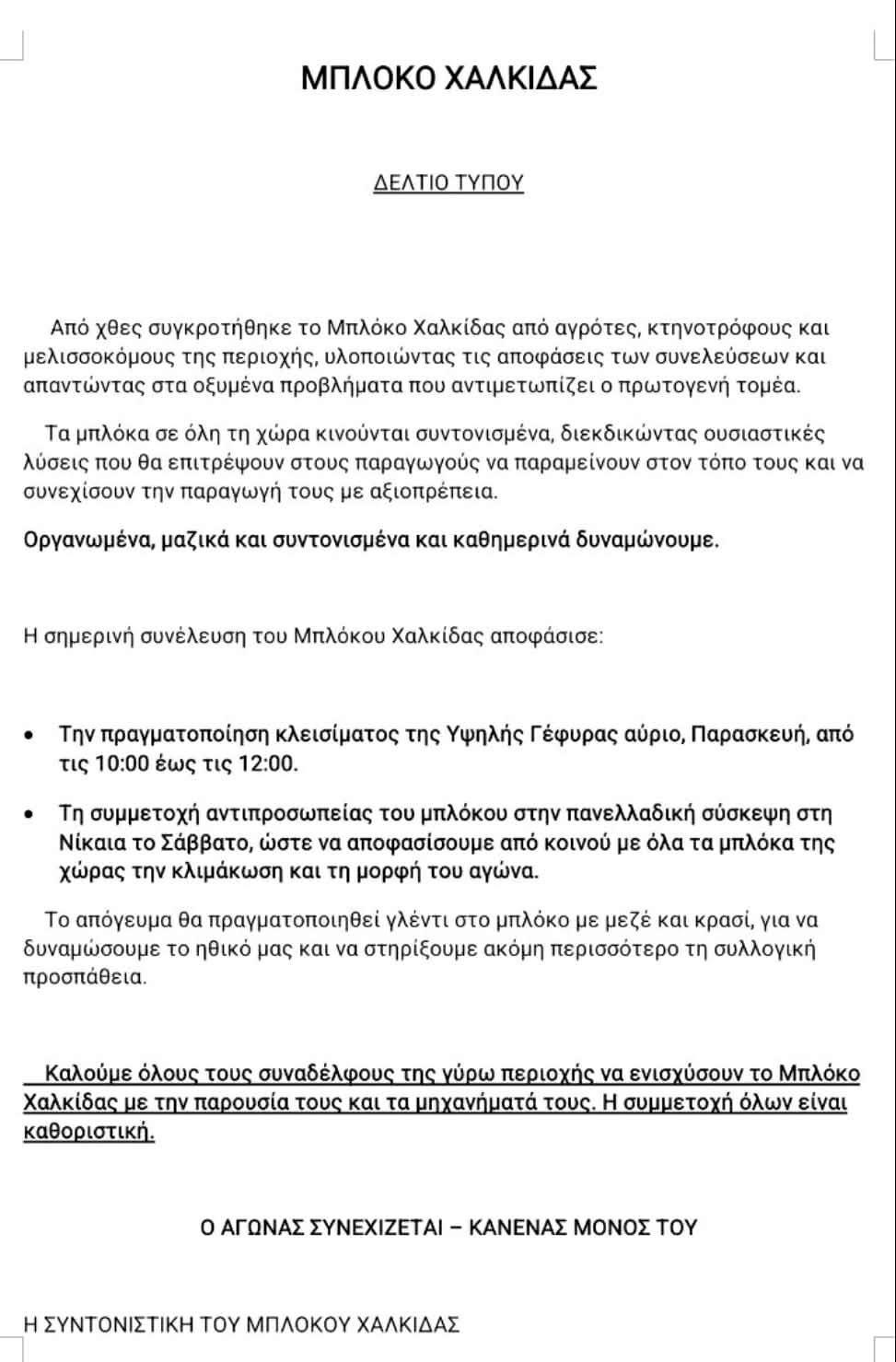 Ανοιχτή σήμερα το απόγευμα η υψηλή γέφυρα της Χαλκίδας - Δελτίο τύπου εξέδωσαν οι αγρότες