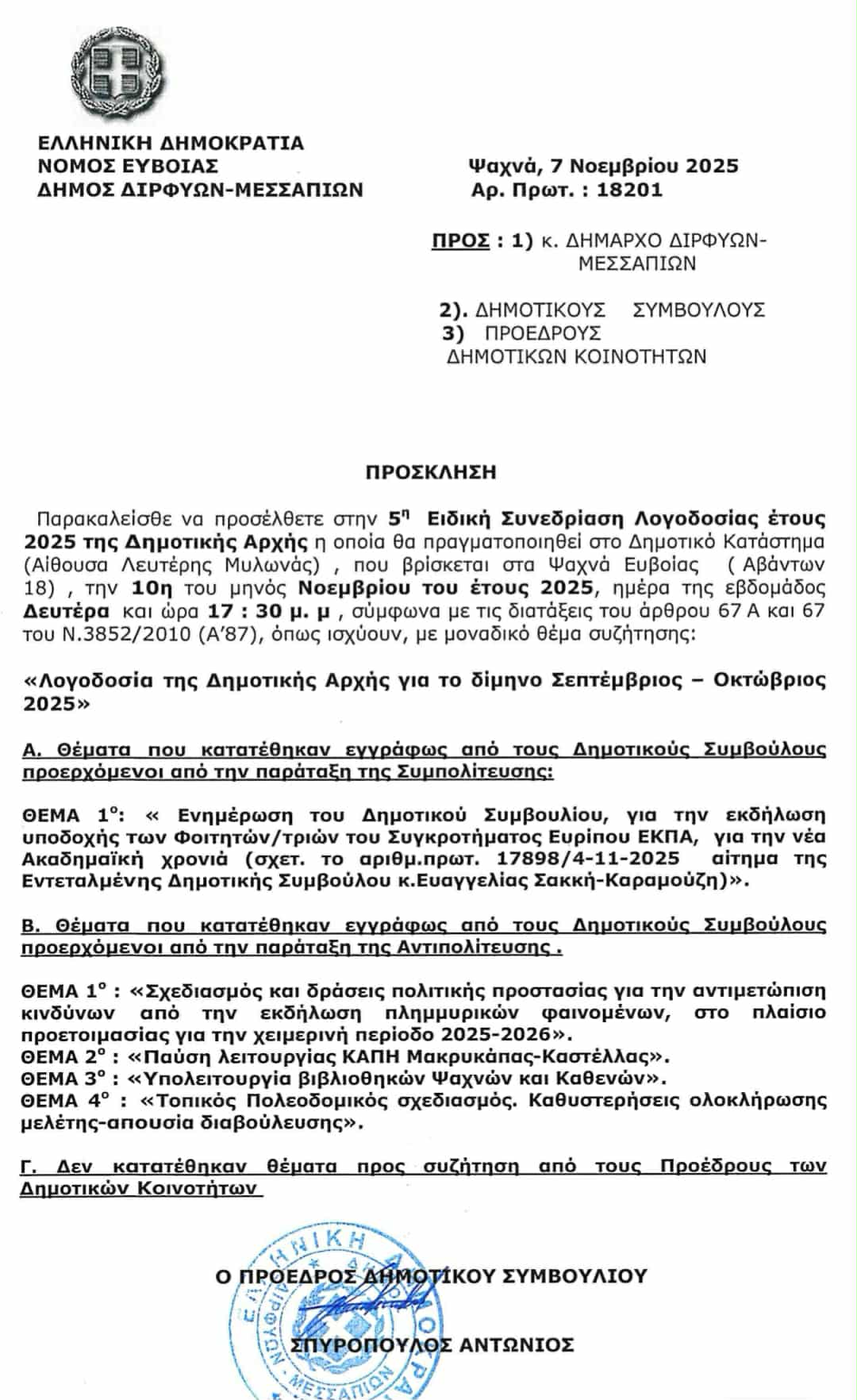 Αύριο Δευτέρα 10 Νοεμβρίου και ώρα 17:30 το απόγευμα θα πραγματοποιηθεί η 5η ειδική συνεδρίαση λογοδοσίας της Δημοτικής αρχής του Δήμου Διρφύων Μεσσαπίων για τους μήνες Σεπτέμβριο και Οκτώβριο