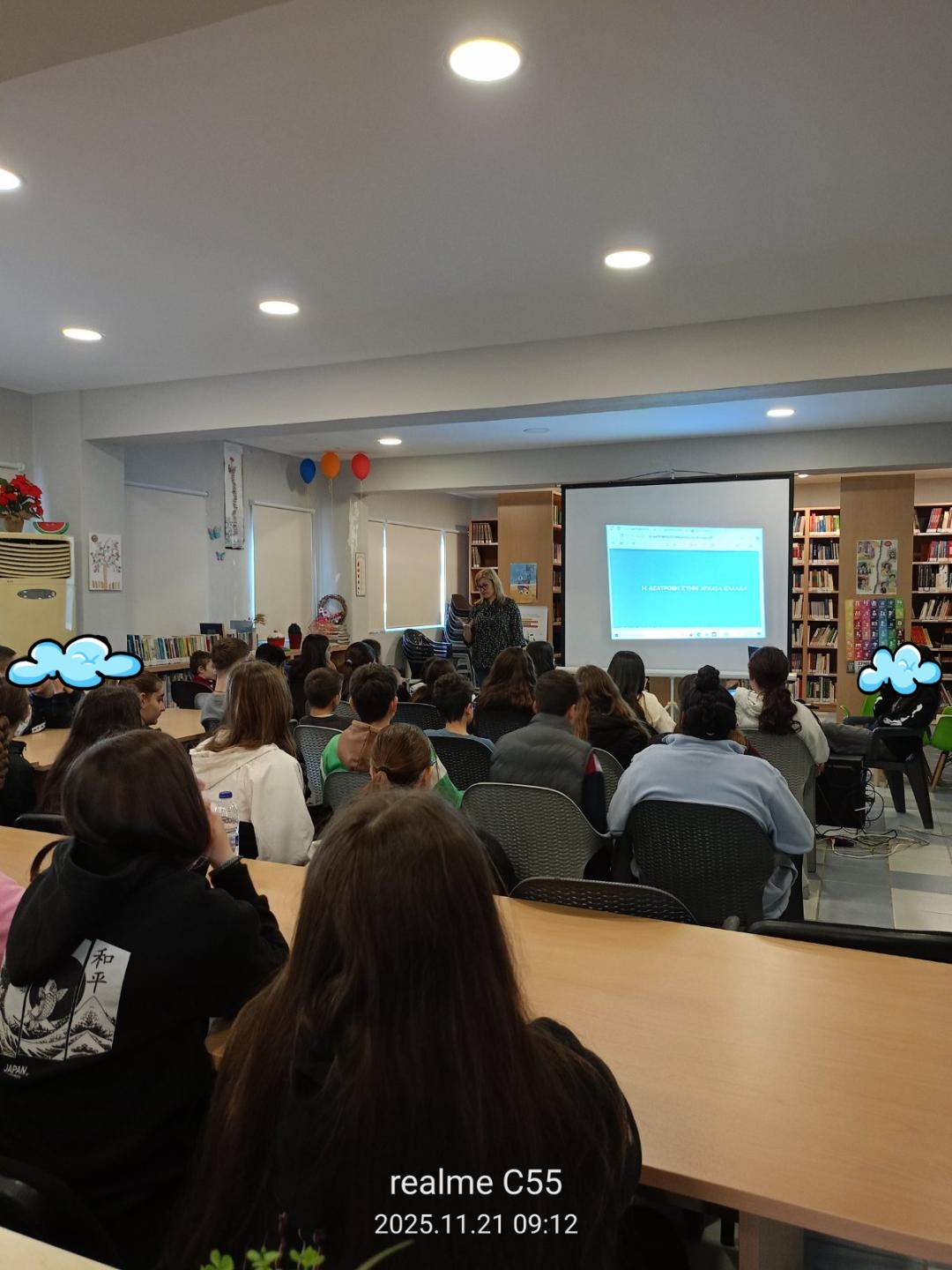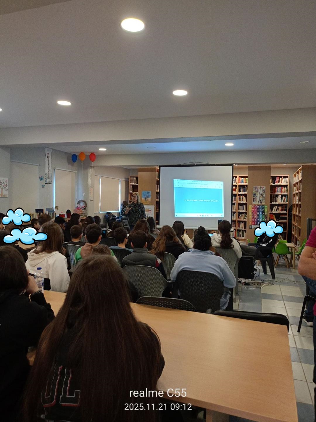 Στο πλαίσιο του Προγράμματος «Ενεργός Πολίτης – Πυλώνας 3: Υγεία και Ευημερία», το Γυμνάσιο Καθενών, πραγματοποίησε την Παρασκευή 21 Νοεμβρίου 2025 εκπαιδευτική επίσκεψη στη Δημοτική Βιβλιοθήκη Καθενών με θέμα τη διατροφή των Αρχαίων Ελλήνων.