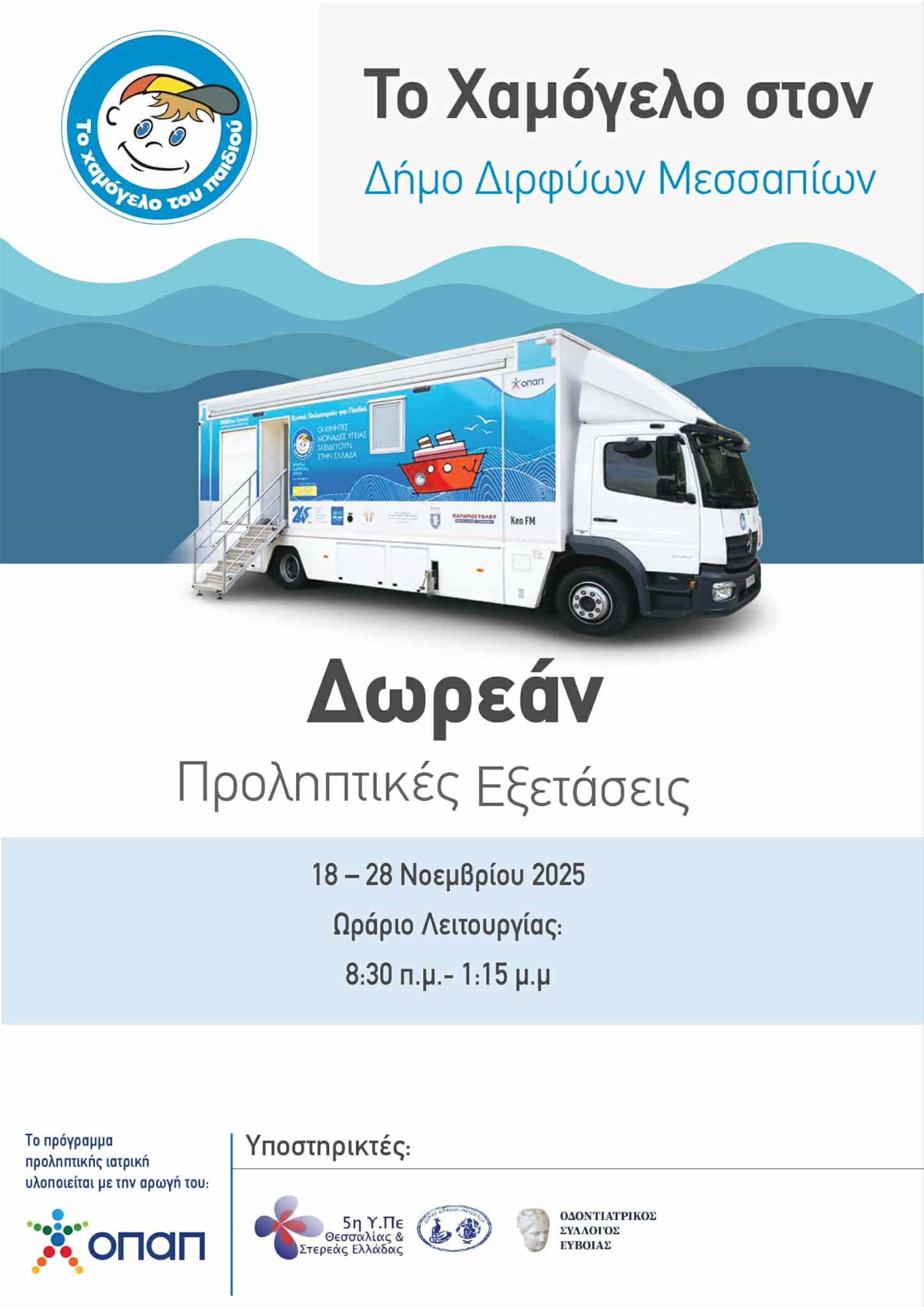 Οι Κοινωνικές Υπηρεσίες- Βοήθεια στο Σπίτι του Δήμου Διρφύων Μεσσαπίων σε συνεργασία με τον Οργανισμό «Το Χαμόγελο του Παιδιού», την 5η Υγειονομική Περιφέρεια και τον Οδοντιατρικό Σύλλογο Ευβοίας, διοργανώνουν Δράση Προληπτικής Οδοντιατρικής εξέτασης “Ιπποκράτης» και κοινωνικής παρέμβασης στους μαθητές των Δημοτικών Σχολείων του Δήμου μας, κατά το χρονικό διάστημα από τις 18 έως και τις 28 Νοεμβρίου.