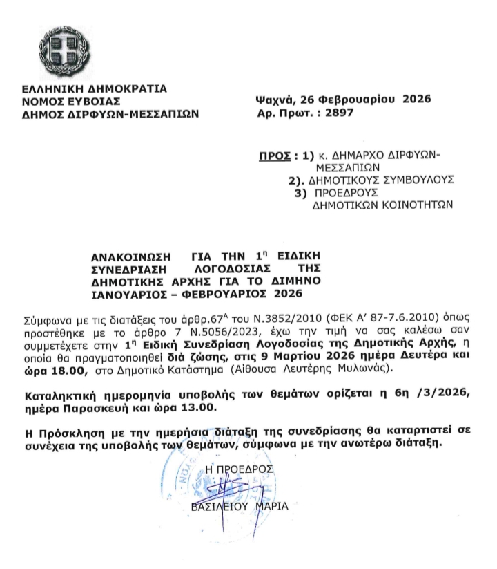 Τη Δευτέρα 9 Μαρτίου και ώρα 18:00 θα πραγματοποιηθεί η πρώτη ειδική συνεδρίαση λογοδοσίας της δημοτικής αρχής για το έτος 2026 για το δίμηνο Ιανουάριος – Φεβρουάριος