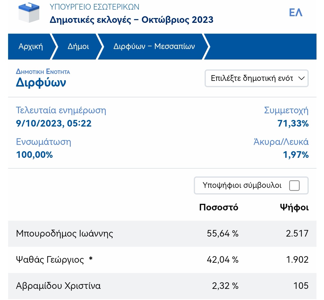 Δημοτική Κοινότητα Διρφύων:Αποτελέσματα Δημοτικών εκλογών 100%