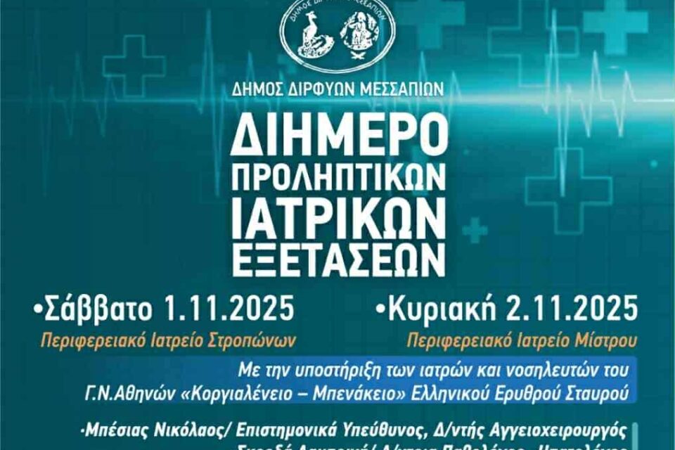 Στα πλαίσια εφαρμογής προγραμμάτων πρόληψης και προαγωγής η υπηρεσία «Βοήθεια στο σπίτι» Δ. ΔιρφύωνΜεσσαπίων σε συνεργασία με την Επιμελήτρια Α’ Γενικής Ιατρικής Π.Ι. Στροπώνων – Κ.Υ. Ψαχνών και αρμόδια Αντιδήμαρχο Υγείας, Προσχολικής Αγωγής, Κοινωνικής Πολιτικής και Ισότητας των φύλων, κα Αφένδρα Σοφία και με την υποστήριξη και τησυνεργασία του Ιατρικού και Νοσηλευτικού προσωπικού του Γενικού Νοσοκομείου Αθηνών Κοργιαλένειο -Μπενάκειο Ελληνικός Ερυθρός Σταυρός διοργανώνει διήμερο δωρεάν προληπτικών ιατρικών εξετάσεων για όλους τους δημότεςκαι κατοίκους του Δήμου ΔιρφύωνΜεσσαπίων.
