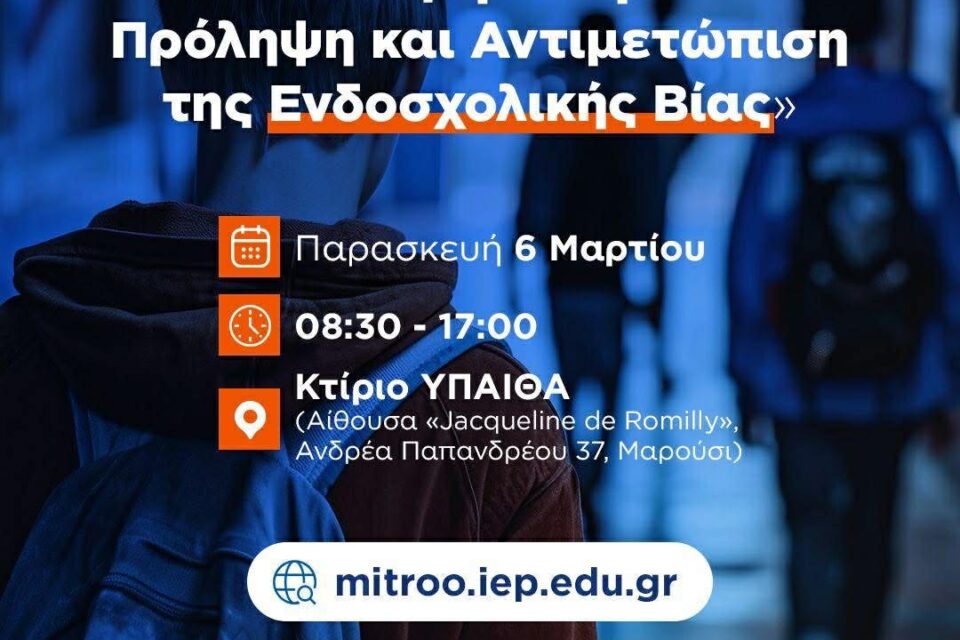Διακρατικό Επιστημονικό Συνέδριο Ελλάδας – Κύπρου με θέμα: «Μαζί για την Πρόληψη και Αντιμετώπιση της Ενδοσχολικής Βίας», συνδιοργανώνουν, την Παρασκευή 6 Μαρτίου 2026 το Υπουργείο Παιδείας, Θρησκευμάτων και Αθλητισμού, το Ινστιτούτο Εκπαιδευτικής Πολιτικής, το Υπουργείο Παιδείας, Αθλητισμού και Νεολαίας της Κυπριακής Δημοκρατίας και το Παιδαγωγικό Ινστιτούτο Κύπρου, στο πλαίσιο εφαρμογής της εθνικής στρατηγικής για την πρόληψη και αντιμετώπιση της Ενδοσχολικής Βίας και του Εκφοβισμού.