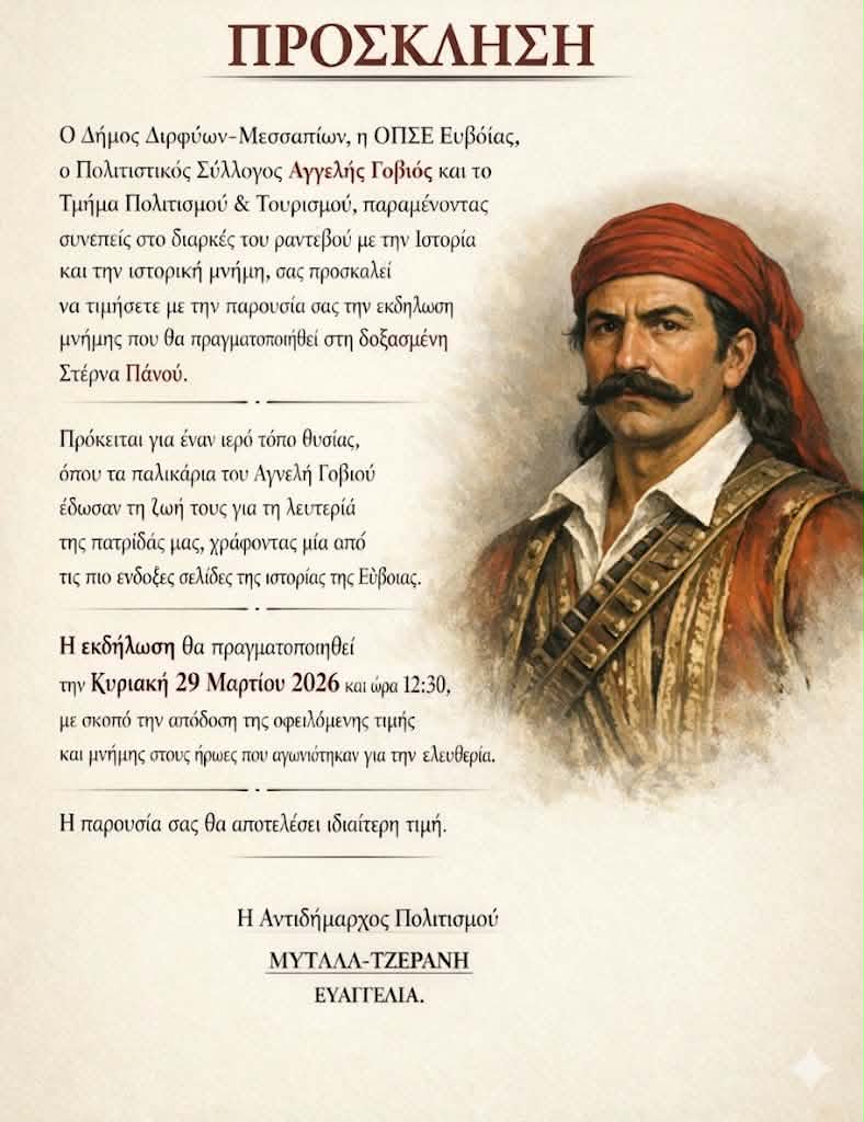 Εκδήλωση μνήμης στον Ιερό τόπο θυσίας (Στέρνα Πανού) που τα παλληκάρια του Αγγελή Γοβιού έδωσαν τη ζωή τους θα πραγματοποιηθεί την Κυριακή 29 Μαρτίου και ώρα 12:30