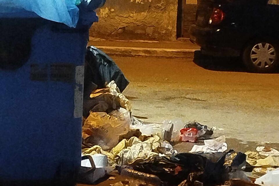 Κάδοι γεμάτοι σκουπίδια, καί σκουπίδια πεταμένα μέσα στη μέση του δρόμου.