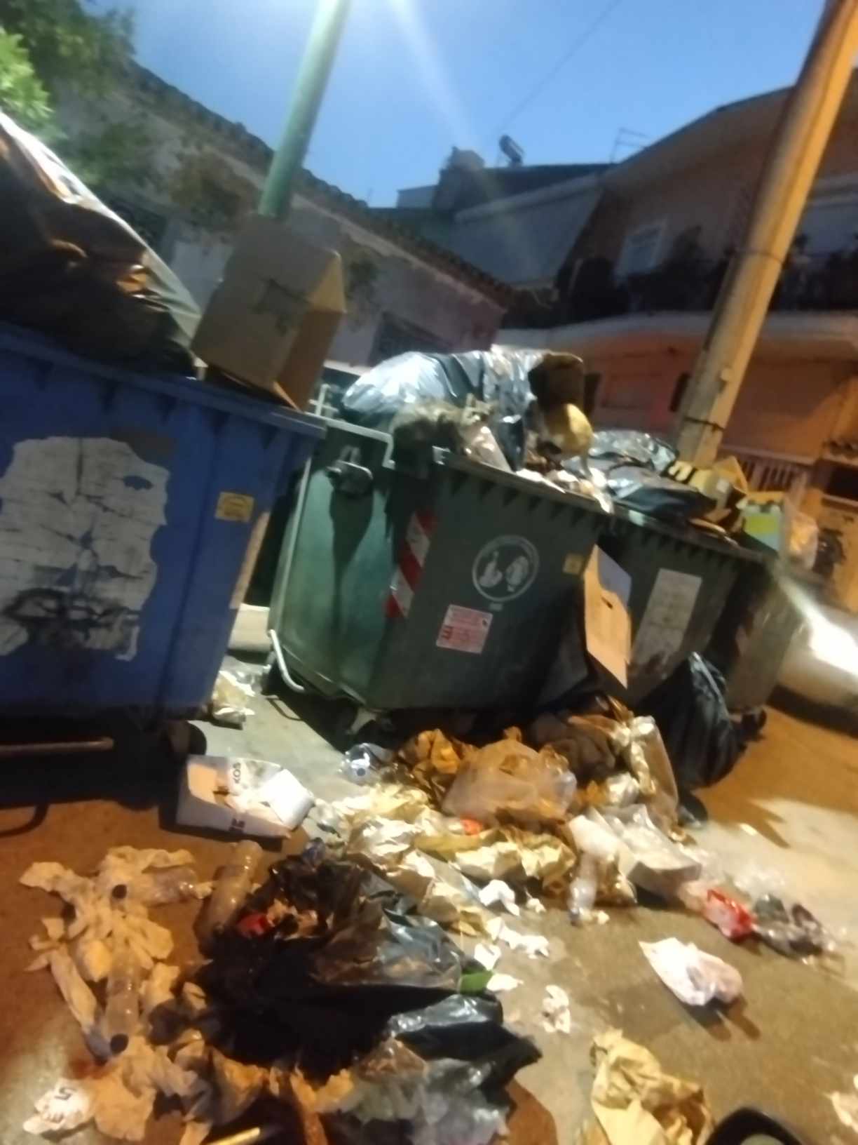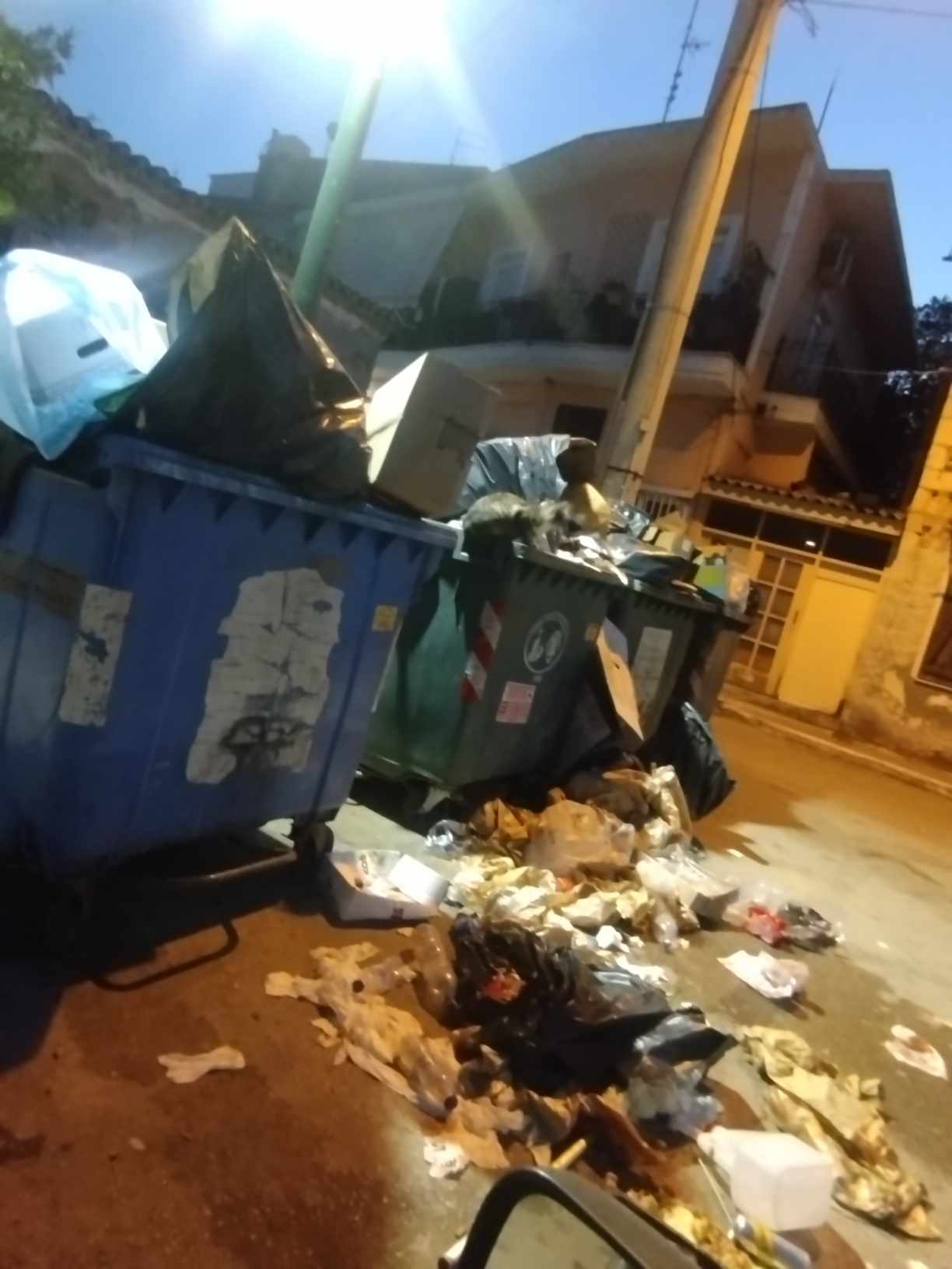 Κάδοι γεμάτοι σκουπίδια, καί σκουπίδια πεταμένα μέσα στη μέση του δρόμου.