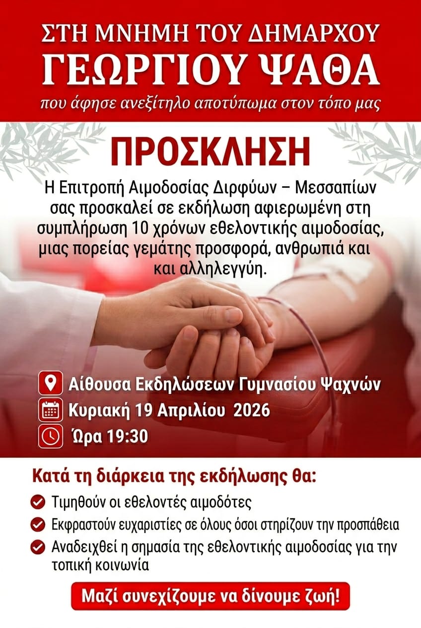 Η επιτροπή Αιμοδοσίας Διρφύων Μεσσαπίων σας προσκαλεί σε εκδήλωση αφιερωμένη στη συμπλήρωση των δέκα χρόνων εθελοντικής αιμοδοσίας, μίας πορείας γεμάτης προσφοράς, ανθρωπιάς καί αλληλεγγύης.