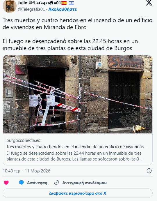 Τουλάχιστον τρεις άνθρωποι έχασαν τη ζωή τους και τέσσερις τραυματίστηκαν, εκ των οποίων δύο παιδιά, σε πυρκαγιά που ξέσπασε σε κτίριο αργά το βράδυ της Τρίτης 10 Μαρτίου, στην πόλη Μιράντα ντε Έμπρο, στη βόρεια Ισπανία, ανακοίνωσαν σήμερα τα ισπανικά συνεργεία διάσωσης.