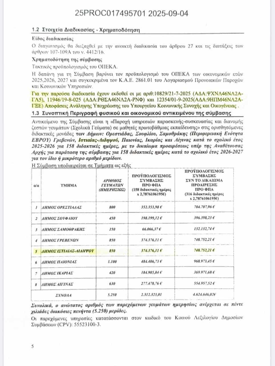 Σύμφωνα με τον προϋπολογισμό, στον Δήμο Ιστιαίας – Αιδηψού αντιστοιχούν 850 ημερήσια γεύματα, με συνολική δαπάνη 374.376,11 ευρώ (χωρίς ΦΠΑ) για 158 διδακτικές ημέρες, και έως 748.752,21 ευρώ σε περίπτωση άσκησης του δικαιώματος προαίρεσης για δύο σχολικά έτη.
