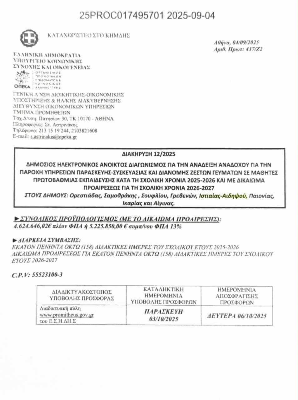 Ήδη έχει προκηρυχθεί από τον ΟΠΕΚΑ η διαγωνιστική διαδικασία για την ανάδειξη του αναδόχου που θα αναλάβει την παρασκευή, συσκευασία και διανομή των ζεστών γευμάτων στις σχολικές μονάδες του Δήμου.