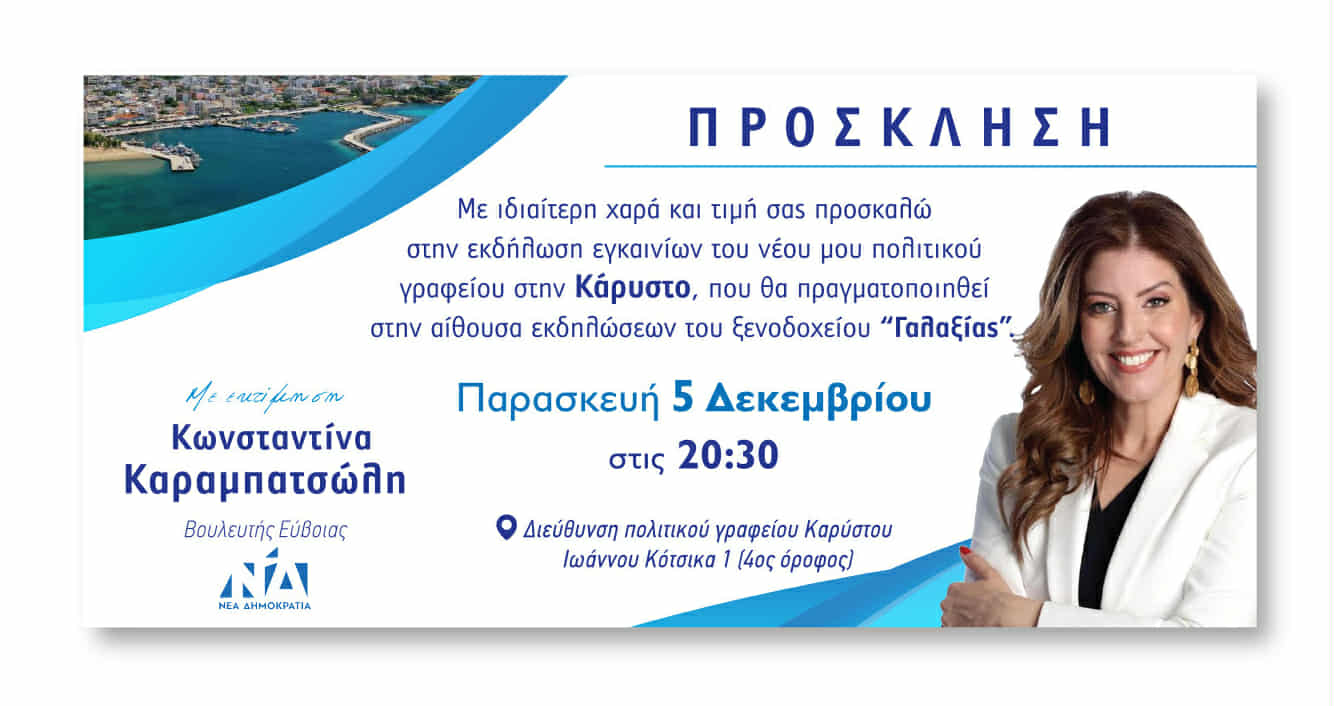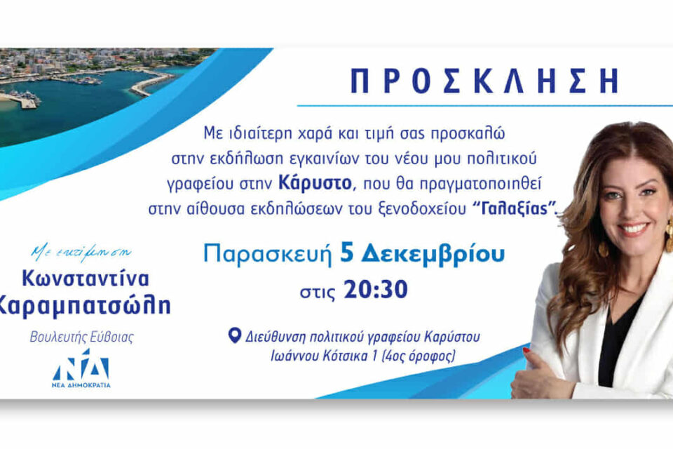 Νέο πολιτικό γραφείο ανοίγει στην Κάρυστο η βουλευτής ΝΔ Κωνσταντίνα Καραμπατσώλη. Τα εγκαίνια θα πραγματοποιηθούν την Παρασκευή 5 Δεκεμβρίου, στις 20:30, στην αίθουσα εκδηλώσεων του ξενοδοχείου «Γαλαξίας».