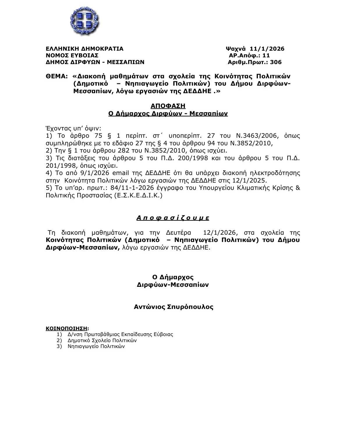 Διαβάστε την ανακοίνωση του Δημάρχου