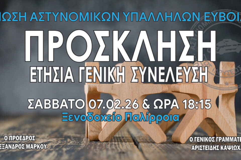 Το Σάββατο, 07-02-2026 στο Ξενοδοχείο “Παλίρροια” στη Χαλκίδα στις 18:15 θα πραγματοποιηθεί εκδήλωση κατά την οποία θα πραγματοποιηθεί η κοπής της  πίτας της Ενωσης Αστυνομικών Υπαλλήλων Ευβοίας,  απονομές τιμητικών διακρίσεων σε αποστρατευθέντες συναδέλφους του έτους 2026, και βράβευση παιδιών μελών της Ένωσης  που πέτυχαν στις πανελλαδικές εξετάσεις, καθώς και παροχή επιδομάτων γέννας.
