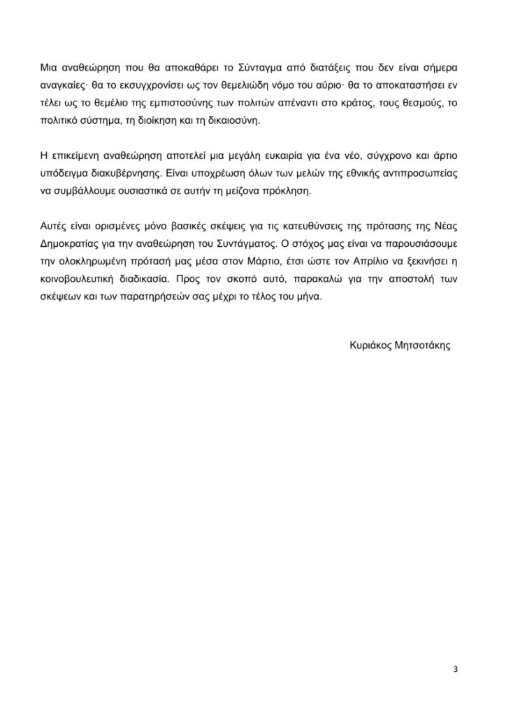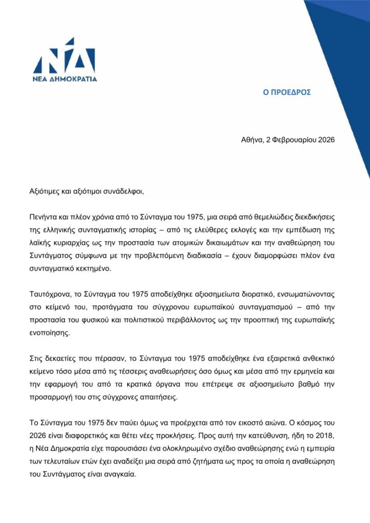 «Σήμερα ανοίγουμε τον διάλογο για τη Συνταγματική Αναθεώρηση, κάνοντας πράξη μία ακόμη θεσμική μας δέσμευση. Ως Πρόεδρος της Νέας Δημοκρατίας, θέλησα να έχω πρώτα τις απόψεις της Κοινοβουλευτικής μας Ομάδας. Έτσι, απευθύνομαι με επιστολή μου στα μέλη της, ώστε οι θέσεις τους να ενσωματωθούν στην τελική μας εισήγηση μέσα στον Μάρτιο. Πρόκειται, άλλωστε, για ένα ζήτημα το οποίο αφορά συνολικά τη δημόσια ζωή, αλλά, τελικά, και τον κάθε πολίτη ξεχωριστά» τόνισε ο Κυριάκος Μητσοτάκης στο τηλεοπτικό μήνυμά του.