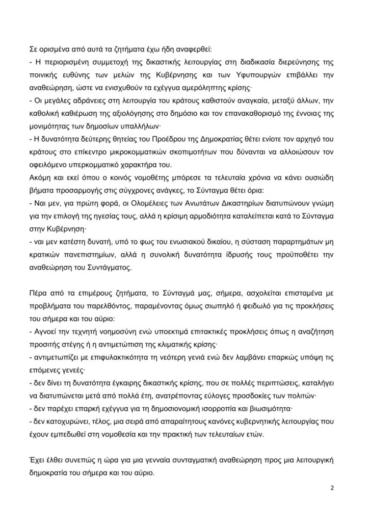 «Επαναλαμβάνω ότι πρόθεσή μας είναι μία γενναία, μία τολμηρή Συνταγματική Αναθεώρηση, που θα απαντά στις ανάγκες των εξελίξεων. Γι’ αυτό θα πρέπει, οπωσδήποτε, να προβλέπει και δικλίδες οι οποίες θα εγγυώνται τη μόνιμη δημοσιονομική ισορροπία, τη συνεπή κυβερνητική δράση αλλά και την ορθότητα των κομματικών υποσχέσεων, ώστε η χώρα να μην διολισθήσει ποτέ ξανά στα επικίνδυνα μονοπάτια του λαϊκισμού. Αυτά που κρύβουν τις ολέθριες συνέπειες που προκαλούν. Κάτι που, δυστυχώς, έχουμε πληρώσει ακριβά» πρόσθεσε.