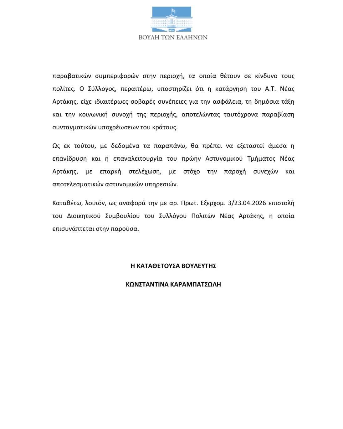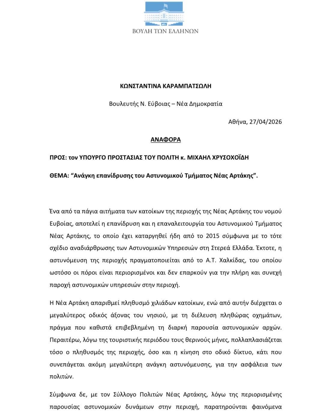 Αναφορά προς τον Υπουργό Προστασίας του Πολίτη κατέθεσε η Βουλευτής Ευβοίας της Νέας Δημοκρατίας, Κωνσταντίνα Καραμπατσώλη, αναδεικνύοντας την ανάγκη άμεσης επαναλειτουργίας του Αστυνομικού Τμήματος Νέας Αρτάκης.
