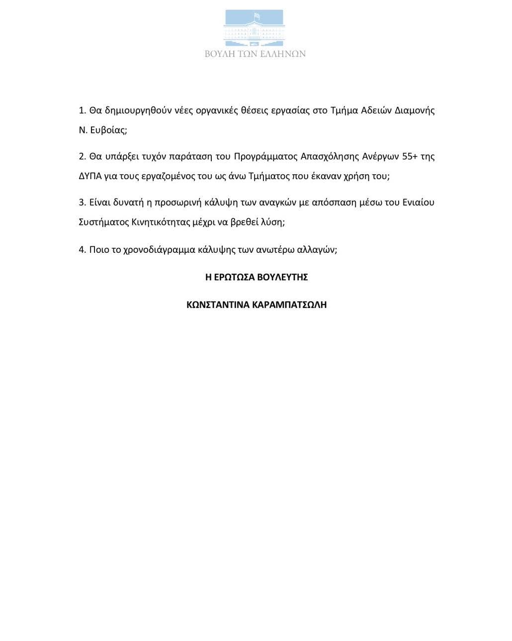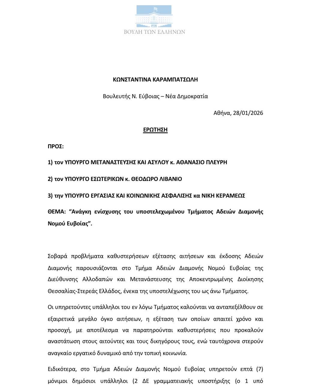 Kοινοβουλευτική ερώτηση κατέθεσε η Βουλευτής Νέας Δημοκρατίας Ευβοίας, Κωνσταντίνα Καραμπατσώλη (Αρ. Πρωτ. 2669/28-1-2026), αναδεικνύοντας το σοβαρό και διαρκώς επιδεινούμενο πρόβλημα λειτουργίας του Τμήματος Αδειών Διαμονής Νομού Ευβοίας.