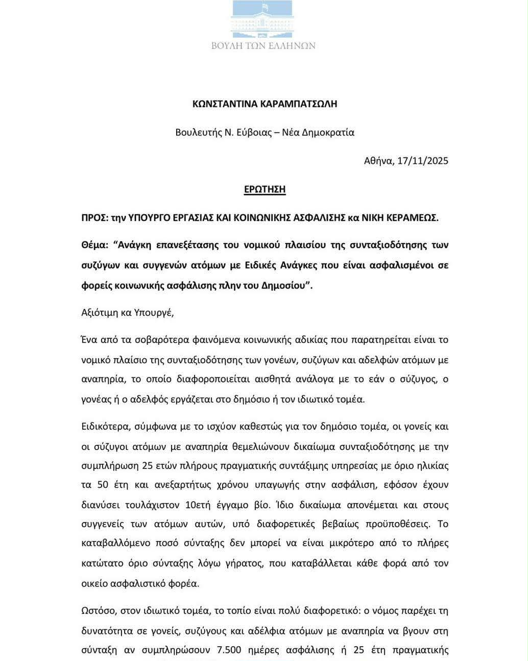 Η Βουλευτής Ευβοίας της Νέας Δημοκρατίας, κα Κωνσταντίνα Καραμπατσώλη, συναντήθηκε με την Υπουργό Εργασίας και Κοινωνικής Ασφάλισης, κα Νίκη Κεραμέως, σε συνέχεια της αριθμ. 1212/17.11.2025 Κοινοβουλευτικής Ερώτησής της, με αντικείμενο την άρση των ανισοτήτων που αντιμετωπίζουν οι φροντιστές ατόμων με αναπηρία μεταξύ Δημόσιου και Ιδιωτικού Τομέα.