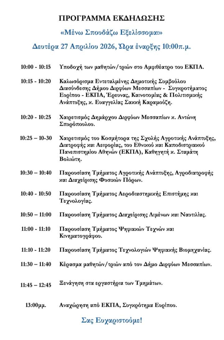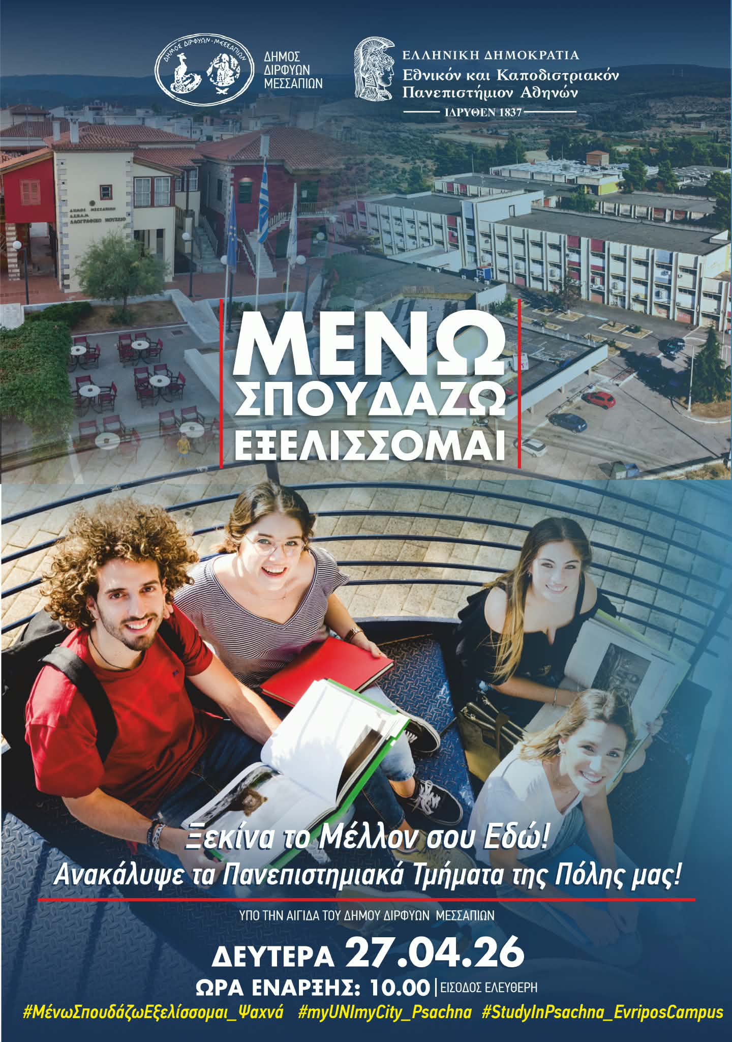 Την εκδήλωση με τίτλο “Μένω Σπουδάζω Εξελίσσομαι” υλοποιεί για 3η συνεχόμενη χρονιά ο Δήμος Διρφύων Μεσσαπίων σε συνεργασία με τα 5 τμήματα του Συγκροτήματος Ευρίπου του ΕΚΠΑ που δραστηριοποιούνται στον Δήμο μας