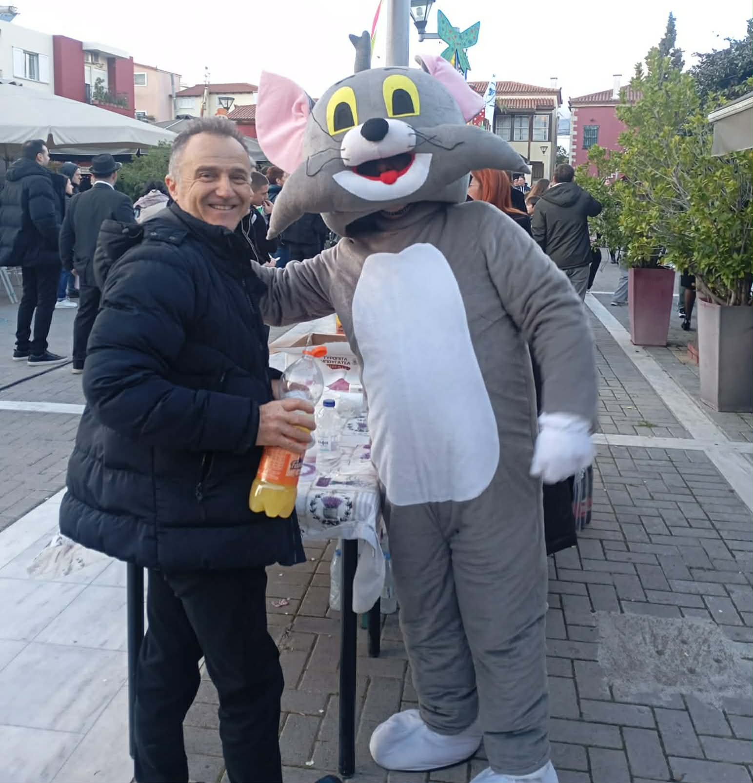 (Στη φωτό ο εθελοντής Μαρίνος Μητρόπουλος με τη στολή του Τομ διασκεδάζοντας τα παιδάκια της περιοχής , με τον Αντιδήμαρχο του Δήμου Δήμο Κιαπέκο)