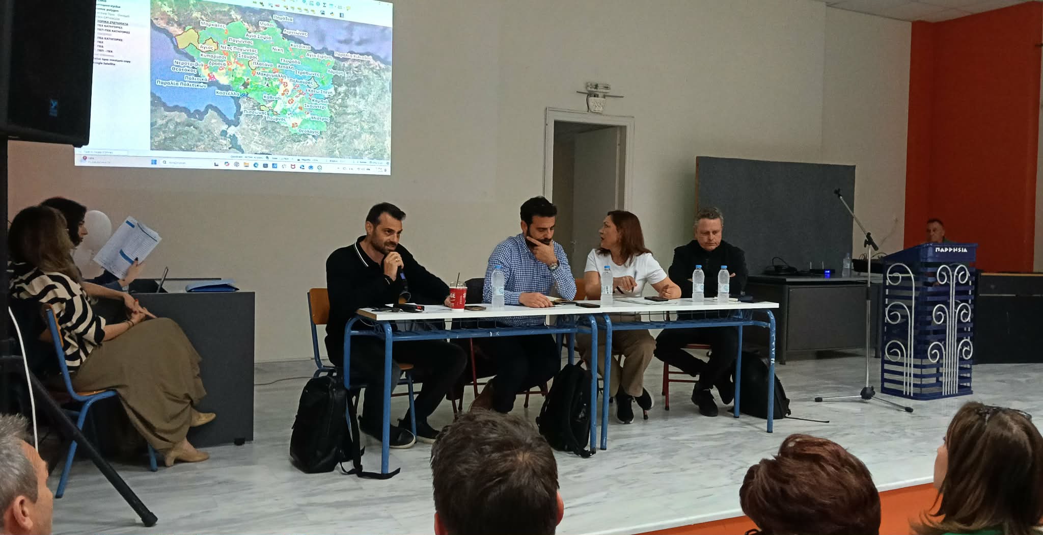 Στην συζήτηση παρευρέθηκαν μέλη της Δημοτικής αρχής και της αντιπολίτευσης, Πρόεδροι τοπικών κοινοτήτων, καθώς επίσης και αρκετοί πολίτες οι οι οποίοι εξέφρασαν τις απορίες τους αλλά και τις αντιδράσεις του τόσο για το δεσμευτικό Προεδρικό διάταγμα όσο καί για την ανησυχητική  συρρίκνωση όλων σχεδόν των κοινοτήτων του Δήμου Διρφύων Μεσαπίων.
