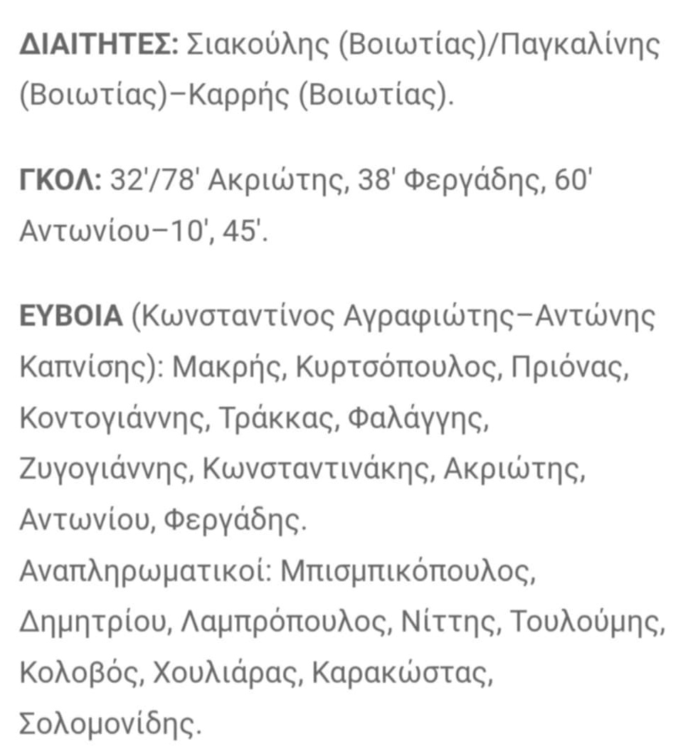 Στο παιχνίδι με τη Φωκίδα αγωνίστηκαν από το Δήμο Διρφύων Μεσαπίων οι Αντώνης Πριόνας και Θανάσης Φαλάγγης του ΑΟ Νέας Αρτάκης,ενώ χρόνο συμμετοχής πήραν επίσης και οι Μπισμπικόπουλος της Ακαδημίας Ψαχνών, και Δημητρίου της Δόξας Διρφύων Μεσσαπίων.