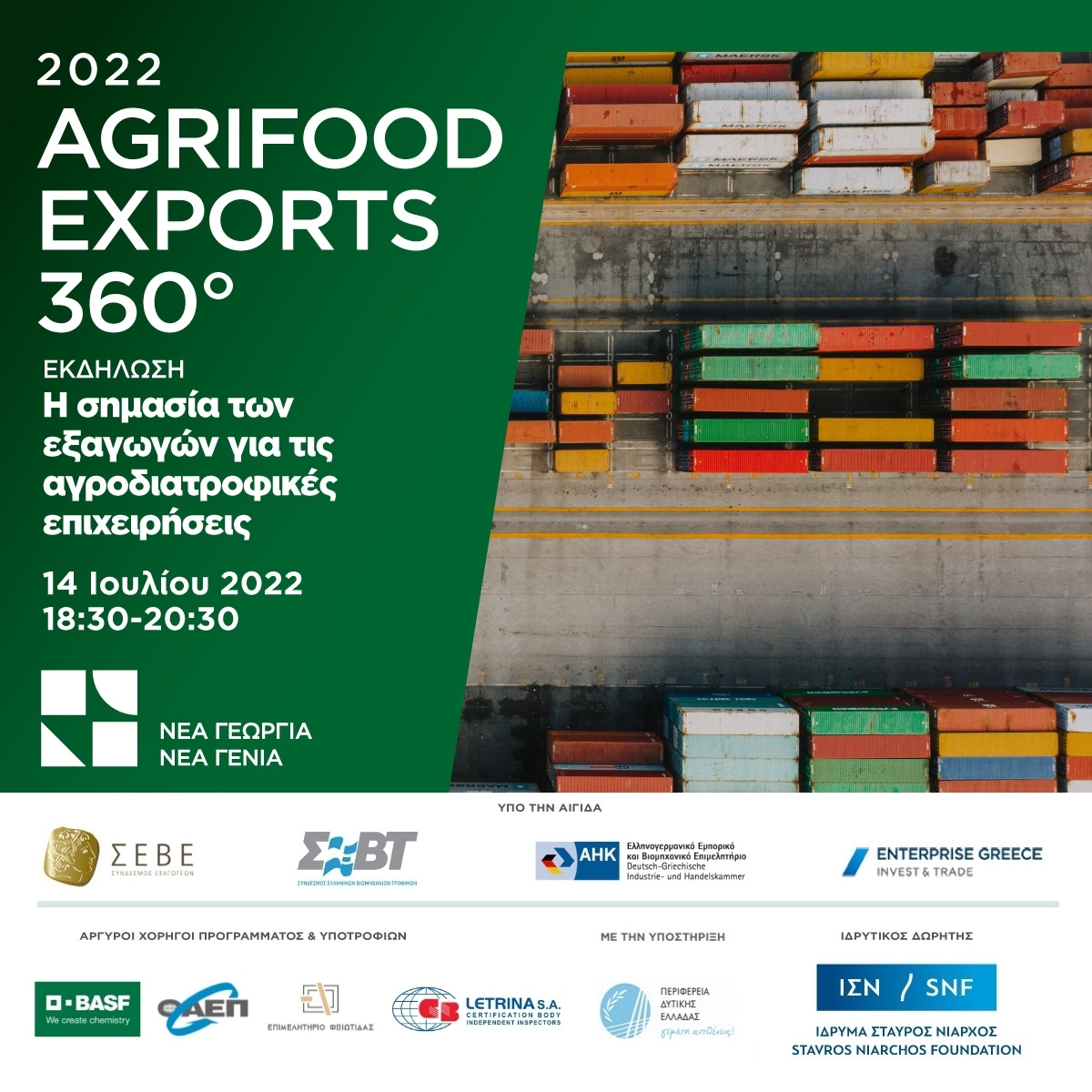 Το AGRIFOOD EXPORTS 360°, το πρώτο εξειδικευμένο και πιστοποιημένο πρόγραμμα επαγγελματικής κατάρτισης στην Ελλάδα, για εξαγωγές αγροδιατροφικών προϊόντων υλοποιείται για τρίτη χρονιά από τον οργανισμό «Νέα Γεωργία Νέα Γενιά», μέσω της ιδρυτικής δωρεάς του Ιδρύματος Σταύρος Νιάρχος (ΙΣΝ). Το πρόγραμμα απευθύνεται σε επιχειρηματίες, στελέχη επιχειρήσεων και συνεταιρισμών αλλά και σε παραγωγούς που επιθυμούν να αναπτυχθούν περαιτέρω εισάγοντας τα προϊόντα και τις υπηρεσίες τους σε αγορές εκτός συνόρων.