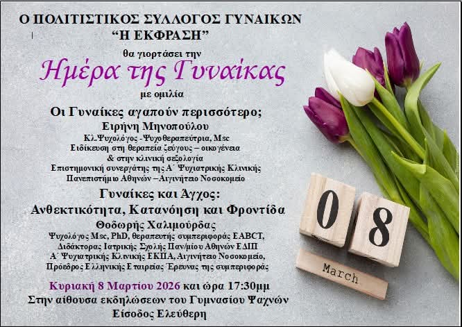 Ο Σύλλογος γυναικών «Η έκφραση» γιορτάζει την ημέρα της γυναίκας σήμερα Κυριακή 8 Μαρτίου με δύο ομιλίες οι οποίες θα πραγματοποιηθούν στην αίθουσα εκδηλώσεων του Γυμνασίου Ψαχνών στις 17:30