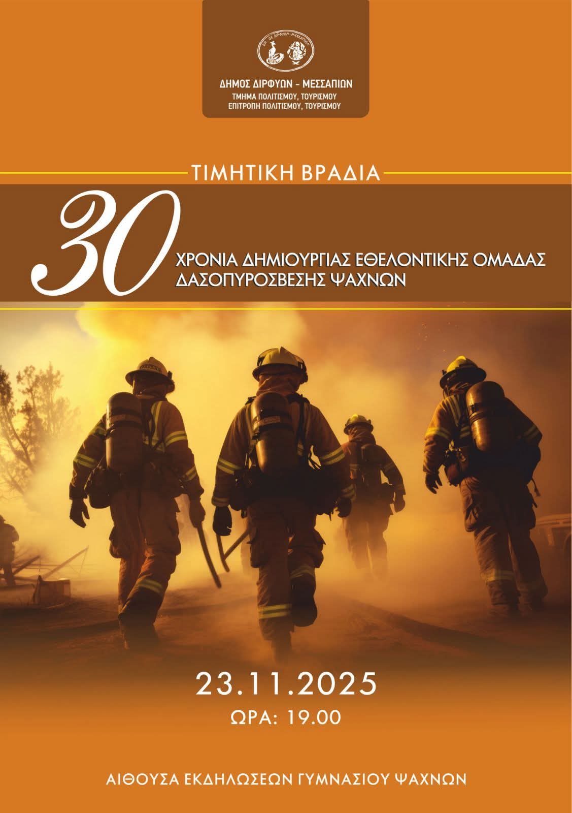 Ο Δήμος Διρφύων-Μεσσαπίων με το τμήμα Πολιτισμού- Τουρισμού και την Επιτροπή Πολιτισμού –Τουρισμού, με επιθυμία και του ίδιου του Δήμαρχου κ. Ψαθά, θέλουν εκφράσουν την ευγνωμοσύνη και τα ευχαριστώ στους Εθελοντές Δασοπυροσβέστες του ΣΕΔΔΔ ψαχνών, όπως αρμόζει για την προσφορά τους και την αυταπάρνηση εμπρός στο ιερό καθήκον να σώζουν και να προστατεύουν ζωές , περιουσίες και γενικότερα το περιβάλλον του τόπου μας και όχι μόνο..! για τα 30 έτη δημιουργίας αυτής της Ομάδας θα πραγματοποιήσει τιμητική εκδήλωση, στις 23/11/2025 ημέρα Κυριακή και ώρα 7μμ, στην αίθουσα εκδηλώσεων του Γυμνασίου Ψαχνών.