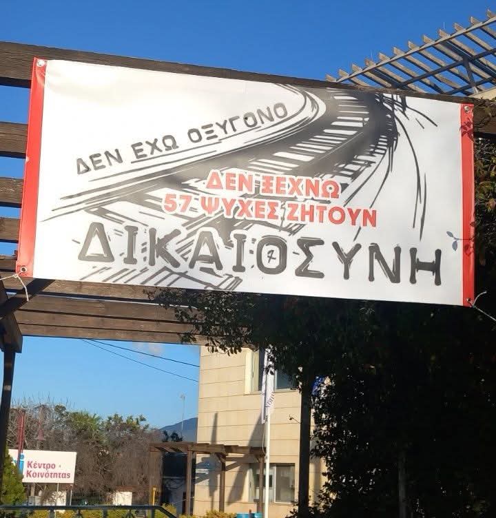 • Πανό με αφορμή την επέτειο από την τραγωδία στα Τέμπη έξω από το Δημαρχείο στα Ψαχνά