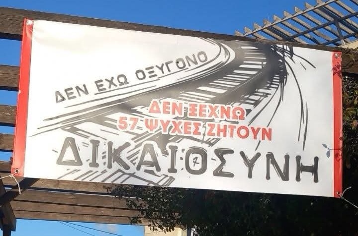 • Πανό με αφορμή την επέτειο από την τραγωδία στα Τέμπη έξω από το Δημαρχείο στα Ψαχνά