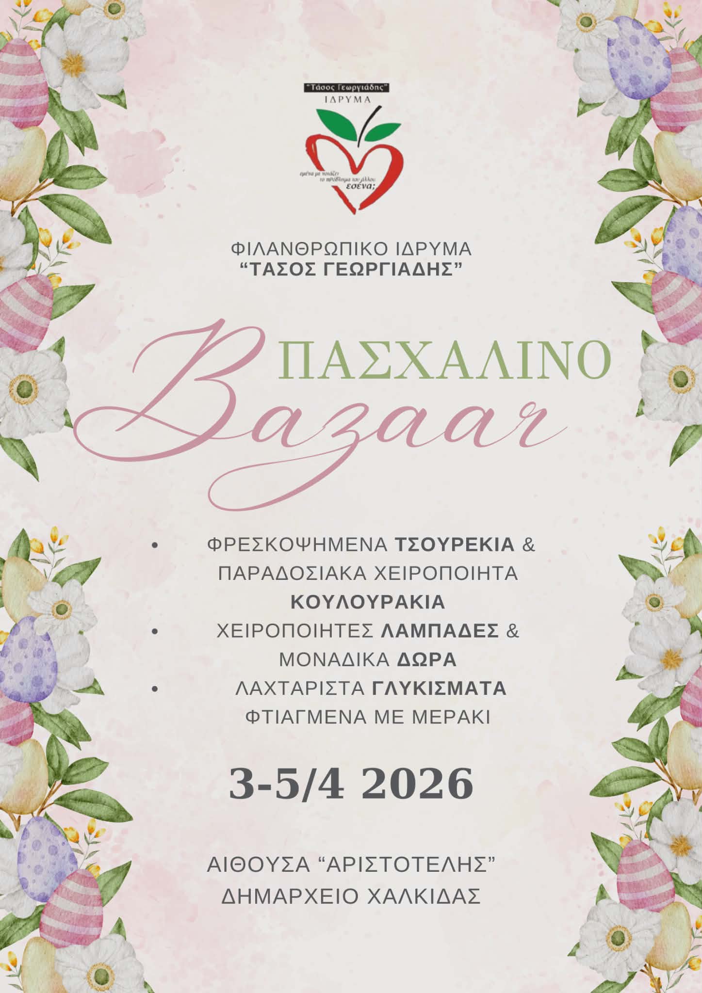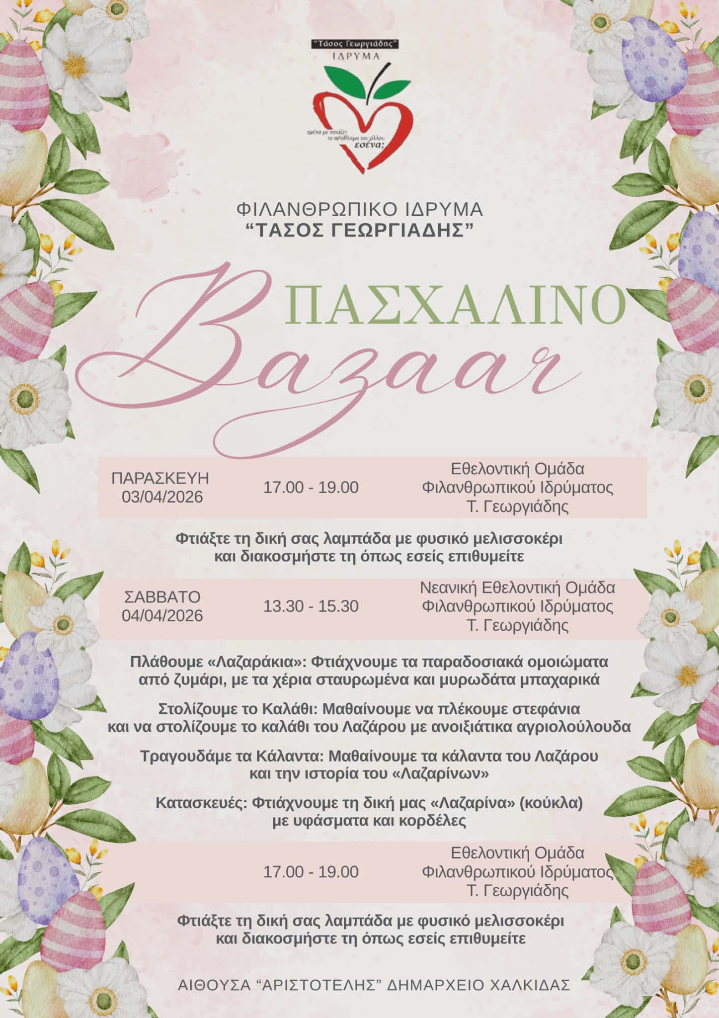 Το Φιλανθρωπικό Ίδρυμα «Τάσος Γεωργιάδης» σάς προσκαλεί σε ένα τριήμερο προσφοράς, παράδοσης και δημιουργίας, από την Παρασκευή 3 έως την Κυριακή 5 Απριλίου 2026, στην Αίθουσα Τέχνης «Αριστοτέλης» (Δημαρχιακού Μεγάρου Χαλκίδας ).