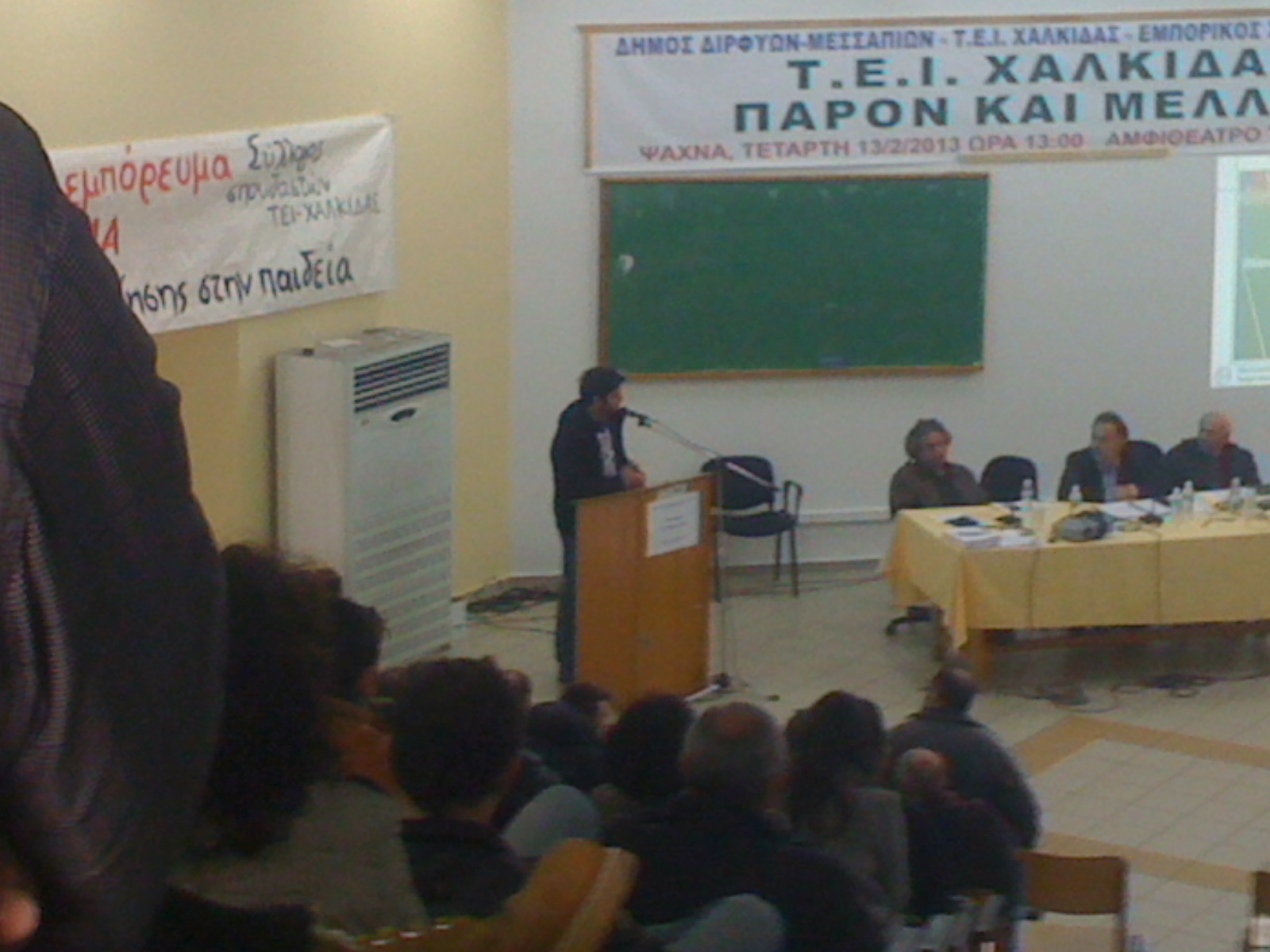 Ακολούθησαν τοποθετήσεις τόσο του Προέδρου του ΤΕΙ αλλά και καθηγητών οι οποίοι μας εξήγησαν με λίγα λόγια ότι το σχέδιο Αθηνά στην προσπάθεια του να διορθώσει το εκπαιδευτικό σύστημα της χώρας “καίει” και το ίδρυμα της Χαλκίδας το οποίο όμως δεν πρέπει σε καμμία περίπτωση να υποβαθμιστεί αφού έχει υψηλότερες βάσεις από αυτό της Λαμίας αρχικά και καταδεύτερον είναι από τα παλαιότερα ιδρύματα στα οποία εκτός των άλλων έχουν αποφοιτήσει και σπουδαστές οι οποίοι έχουν κάνει μεγάλες καριέρες τόσο στην Ελλάδα όσο και στο εξωτερικό.