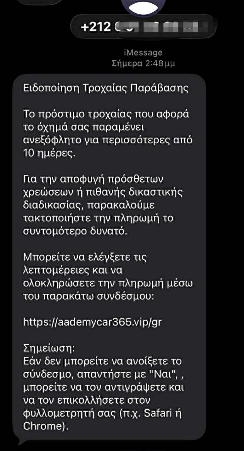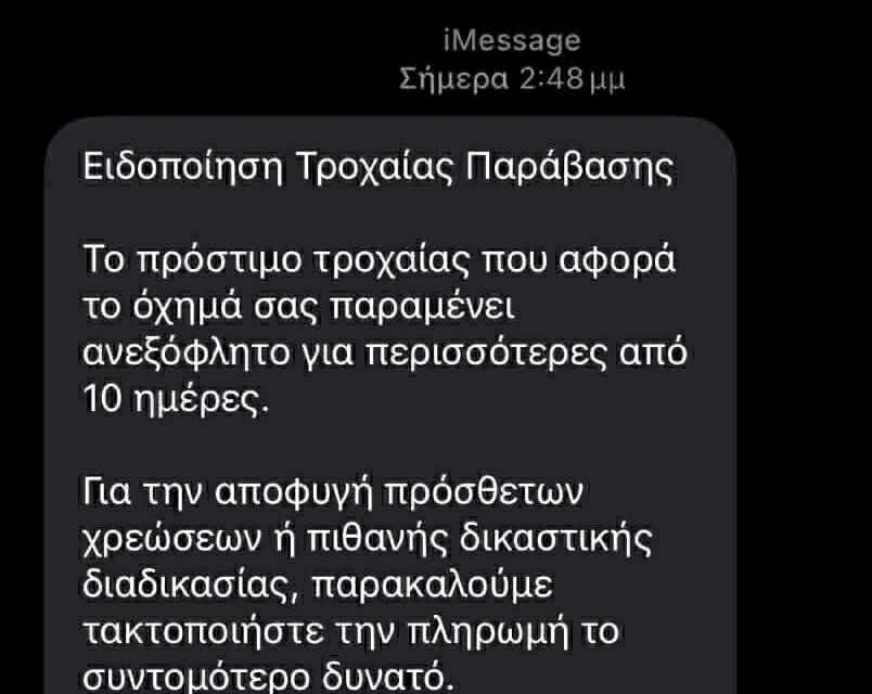 Στα συγκεκριμένα sms  αναφέρεται ότι το πρόστιμο παραμένει απλήρωτο για περισσότερες από 10 ημέρες και ότι, για να αποφευχθούν πρόσθετες χρεώσεις ή πιθανές νομικές διαδικασίες, ο πολίτης πρέπει να τακτοποιήσει άμεσα την πληρωμή μέσω ενός συνδέσμου.