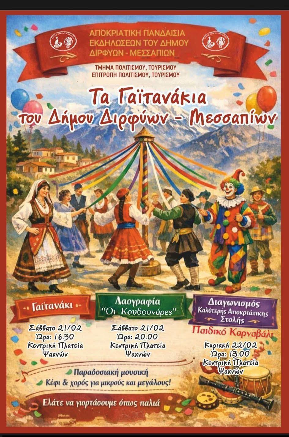Πρόγραμμα αποκριάτικων εκδηλώσεων Πλατεία Ψαχνών 21-22/2/26