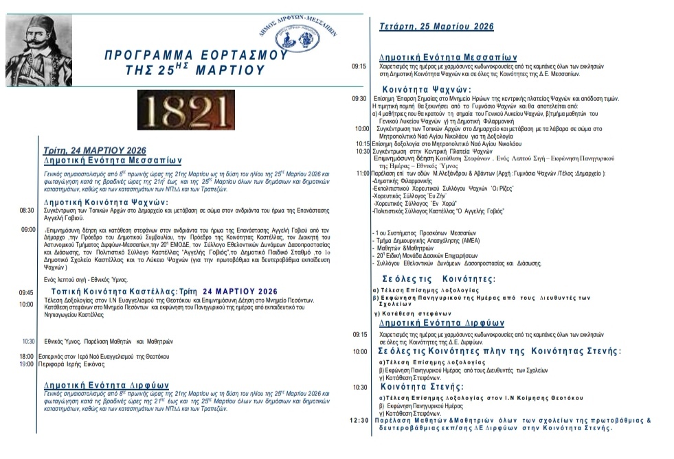 Δείτε εδώ το πρόγραμμα των εορταστικών εκδηλώσεων της Εθνικής Επετείου της 25ης Μαρτίου στον Δήμο Διρφύων Μεσσαπίων.