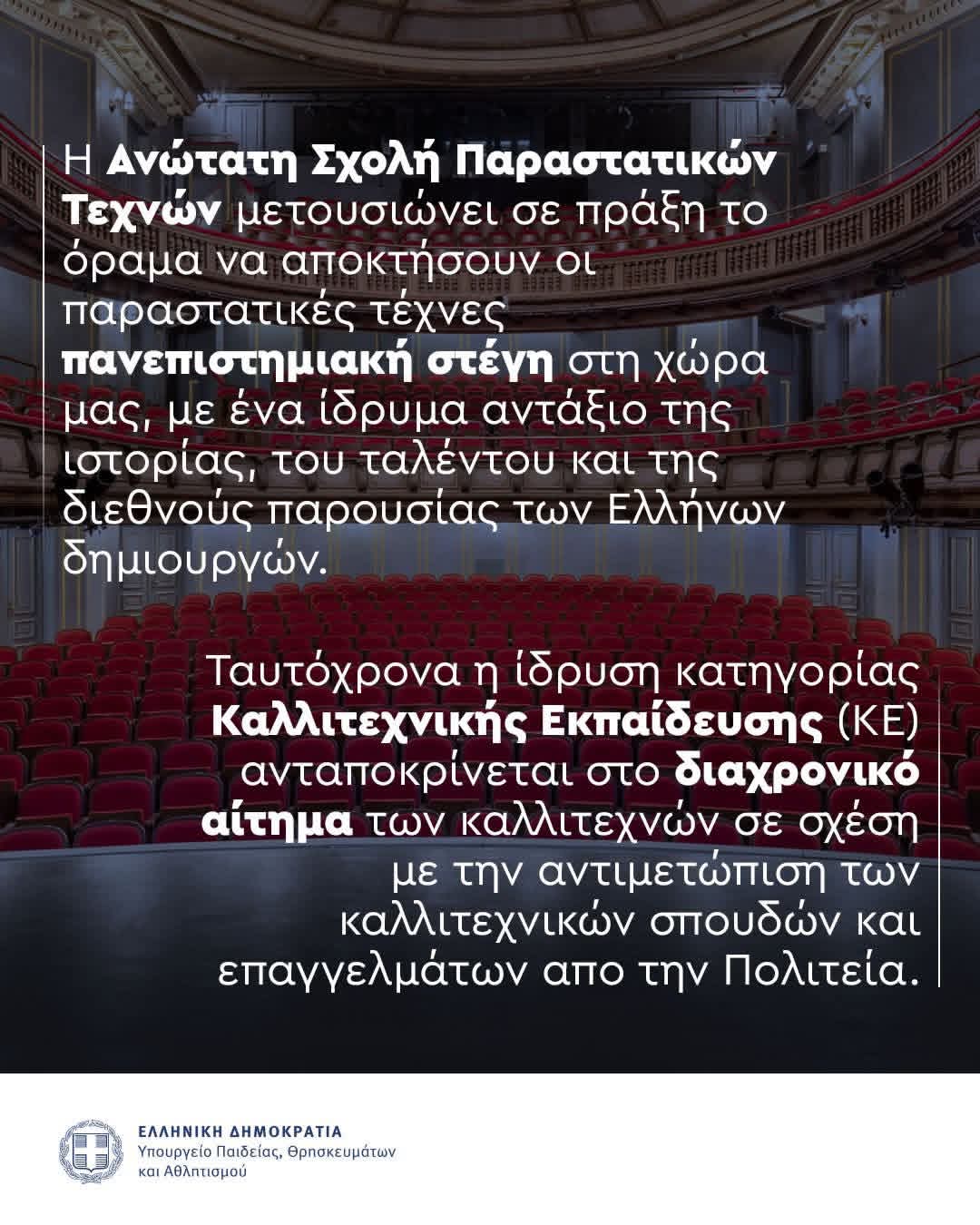 Θέσαμε σε δημόσια διαβούλευση το νομοσχέδιο για την Ίδρυση Ανώτατης Σχολής Παραστατικών Τεχνών και προχωρούμε άμεσα στην ψήφισή του.