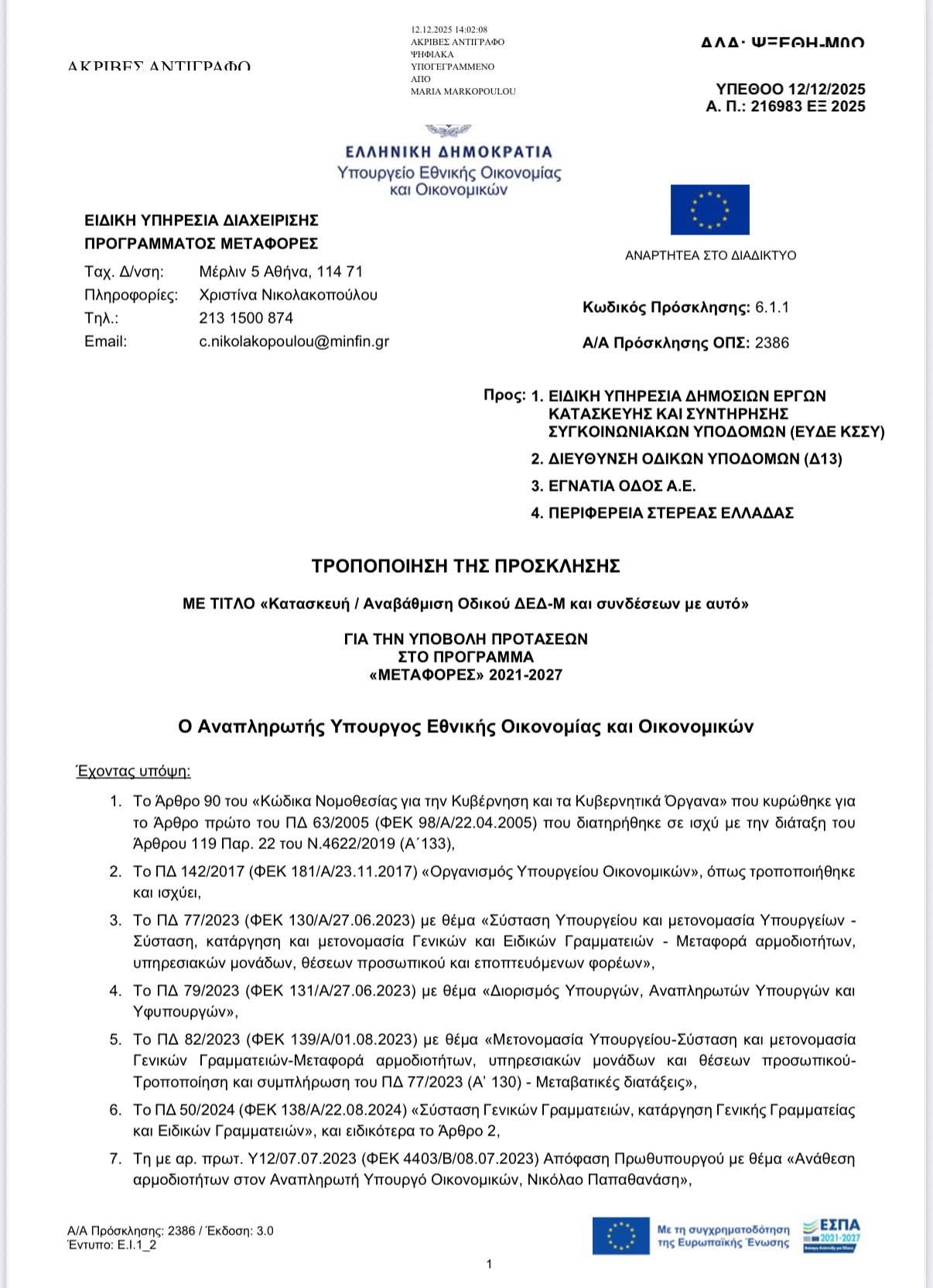 Τα καλύτερα νέα για πριν τα Χριστούγεννα!! Μετά από ατελείωτες προσπάθειες, δουλειά, διεκδίκηση και συνεργασία, το Υπουργείο Οικονομικών εξέδωσε πρόσκληση με δικαιούχο την Περιφέρεια Στερεάς Ελλάδας για την χρηματοδότηση του έργου παράκαμψης Βασιλικού!
