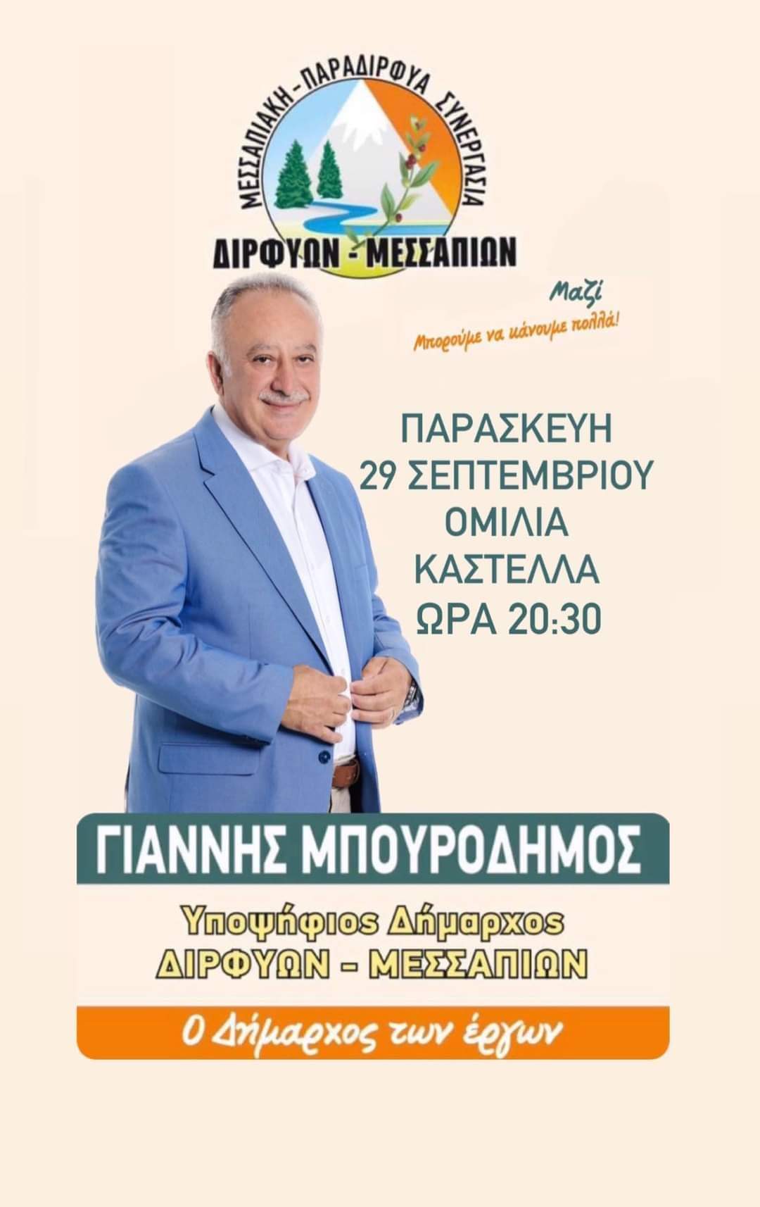Στην Καστέλλα θα βρεθεί σήμερα στις 20:30 το βράδυ  μαζί με τον συνδυασμό του στα πλαίσια της προεκλογικής του περιοδείας, ο Υποψήφιος Δήμαρχος Διρφύων Μεσαπίων  Γιάννης Μπουροδήμος