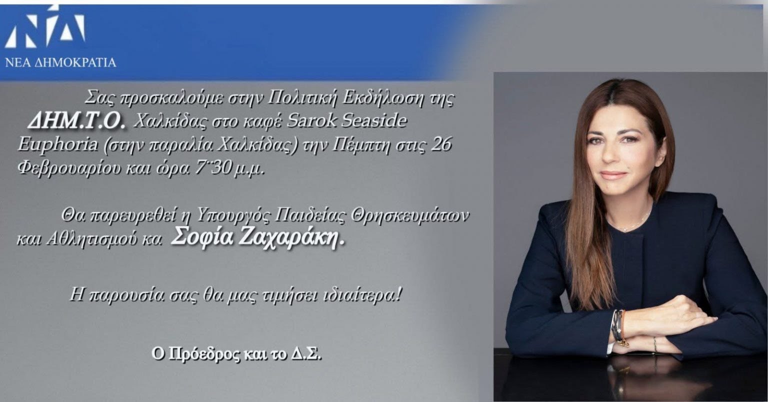 Στη Χαλκίδα θα βρεθεί την ερχόμενη Πέμπτη η Υπουργός παιδείας Σοφία Ζαχαράκη με αφορμή την πολιτική εκδήλωση της ΔΗΜΤΟ Χαλκίδας