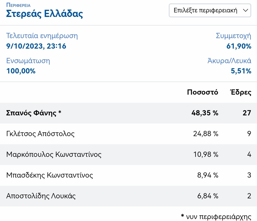 Ο νυν Περιφερειάρχης Στερεάς Ελλάδας Φάνης Σπανός είναι νικητής από την πρώτη Κυριακή με ποσοστό 48,35%.