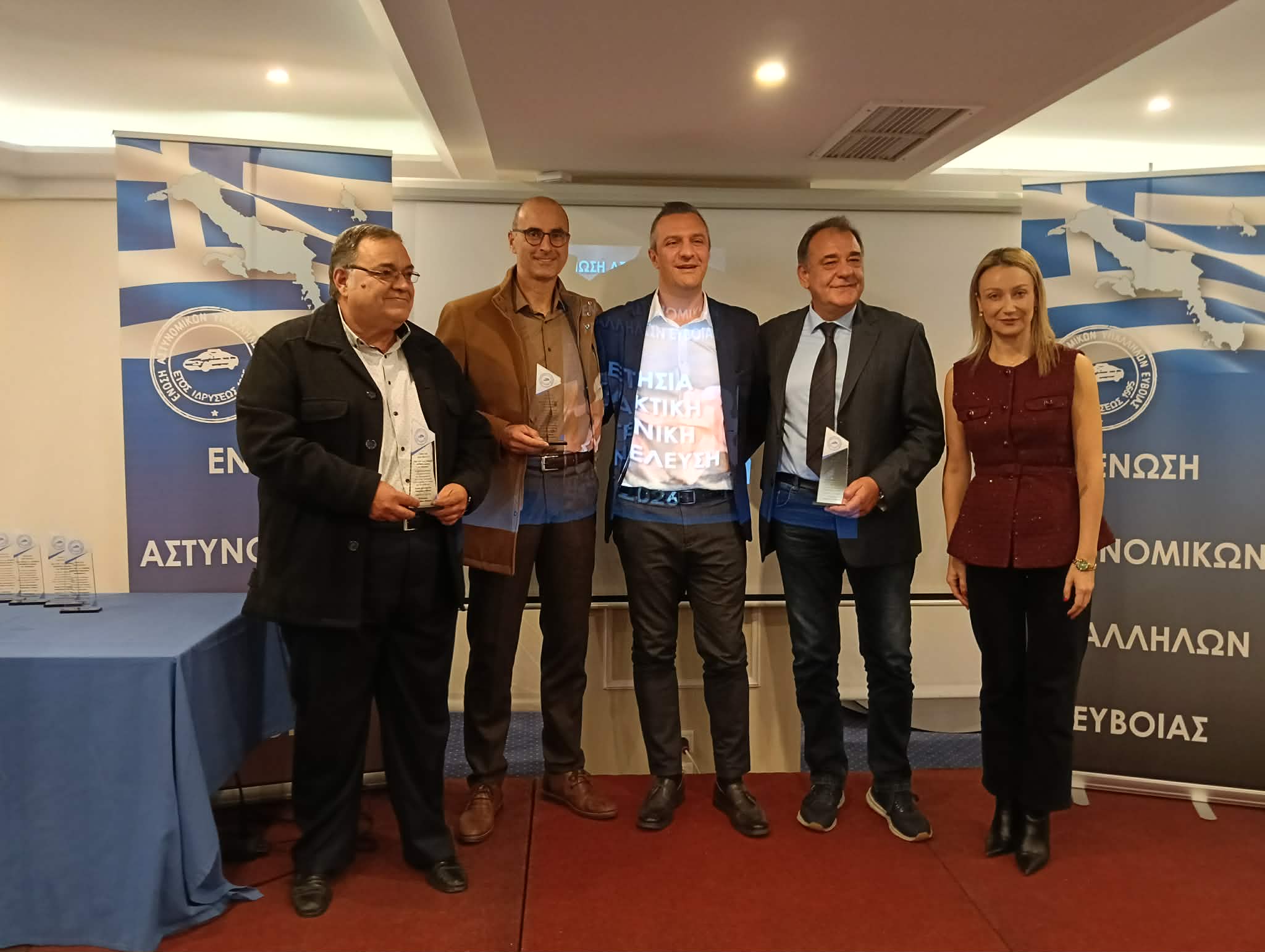 (Πρώτος από αριστερά ο Αστυνομικός Γιάννης Χούμπας με καταγωγή από τα Ψαχνά ο οποίος και εκείνος αποστρατεύτηκε και τιμήθηκε με αναμμηστική πλακέτα)
