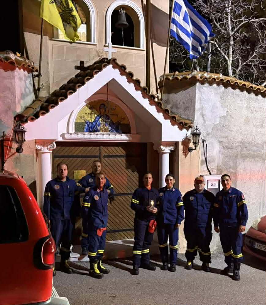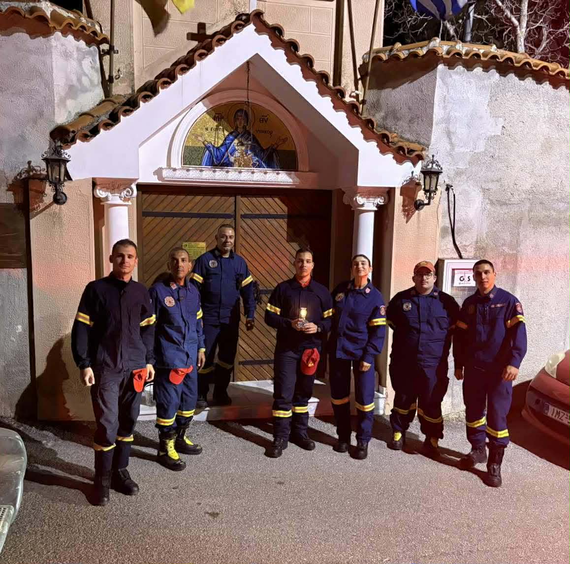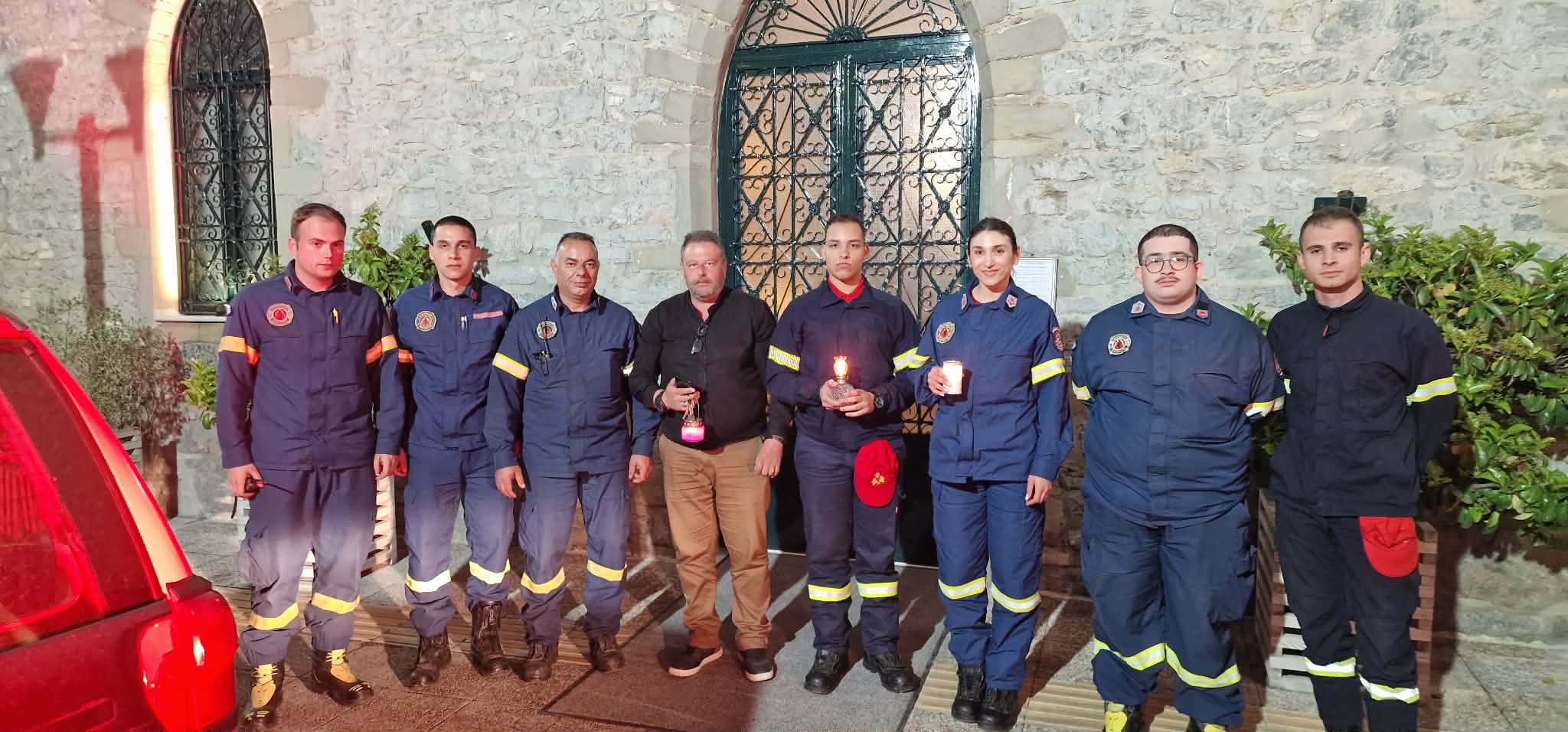 Οι εθελοντές του ΣΕΔΔΔ Ψαχνών με την Πρόεδρο της Καστέλλας κα Γιούλη Κατσού, κατά την παραλαβή του Αγίου Φωτός στην εκκλησία της Καστέλλας